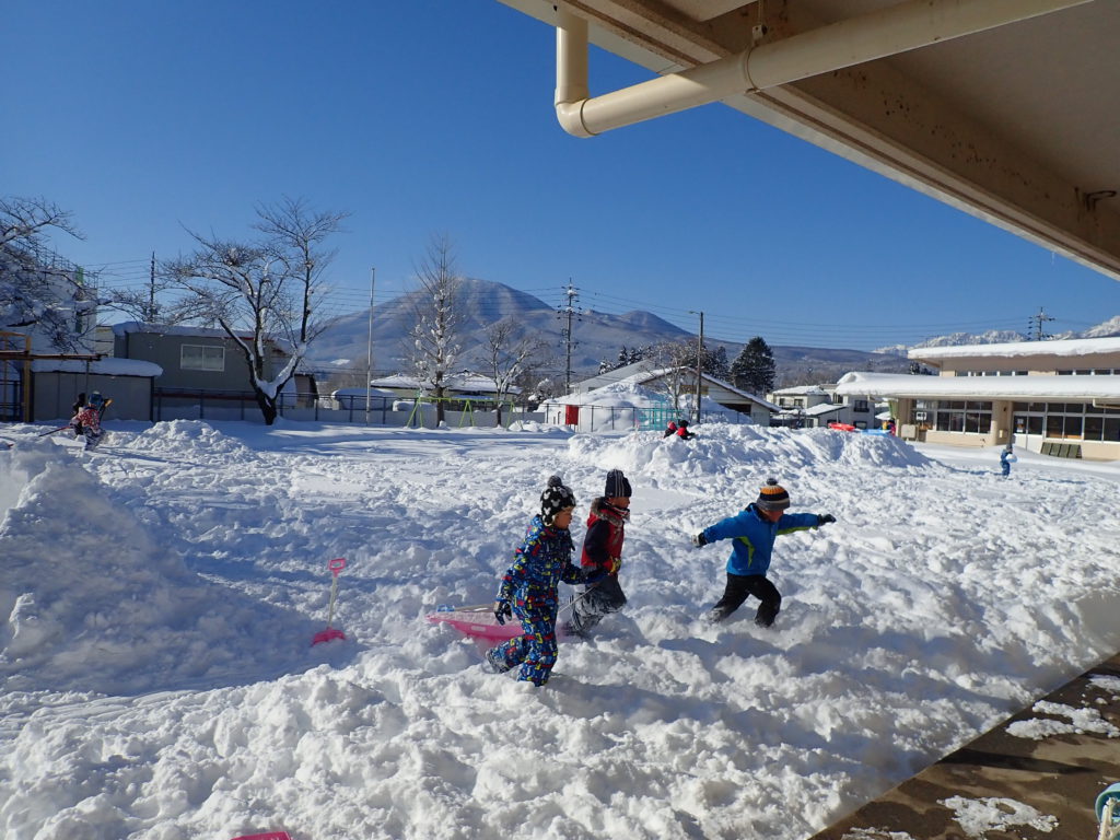 晴れた日の園庭。庭の真ん中に雪山ができたことが嬉しくて毎日のように外で雪遊びを楽しんでいます。