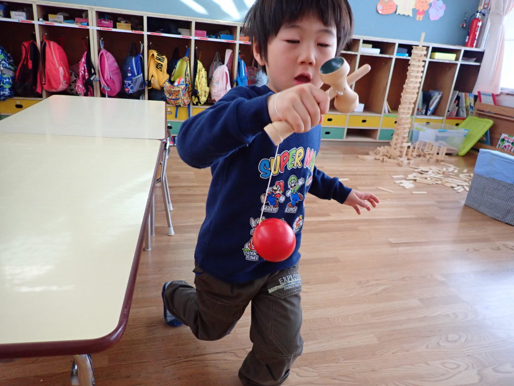 そんな雪遊びもとても楽しいのですが、今、お部屋ではけん玉も子ども達の中で流行っているのです。