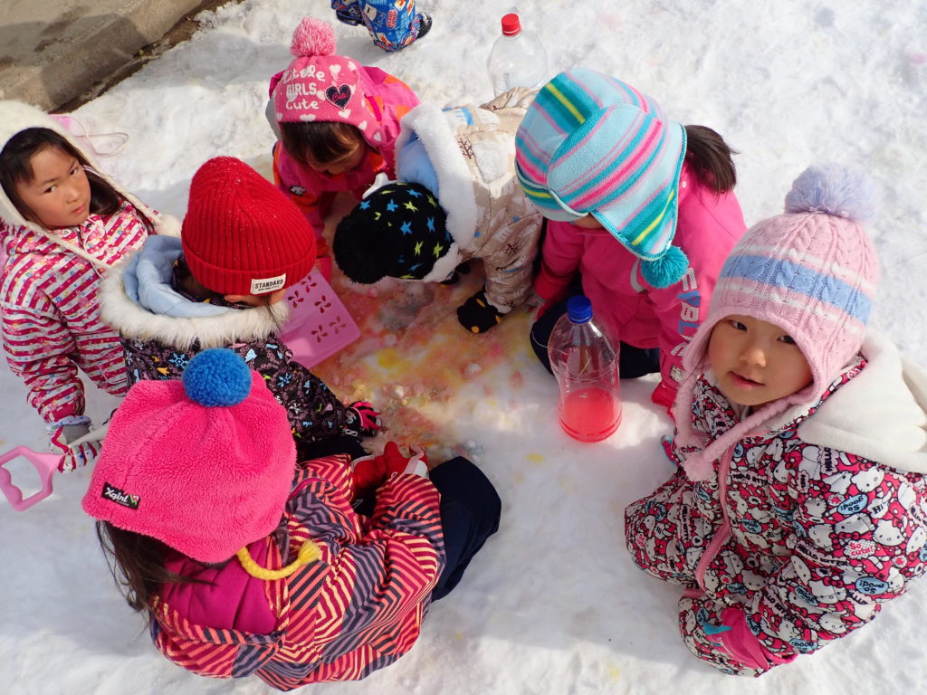 さてこちらでは女の子が雪に色をつけて楽しんでいました。