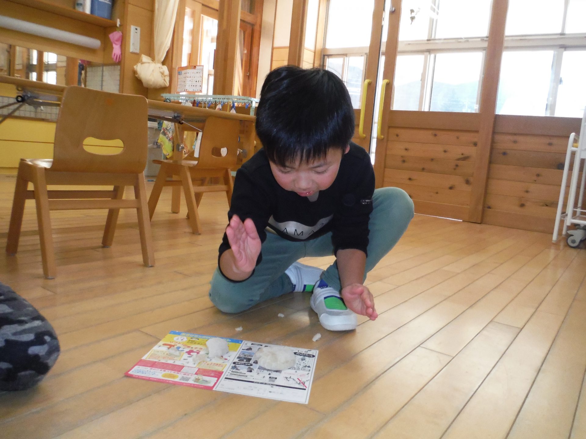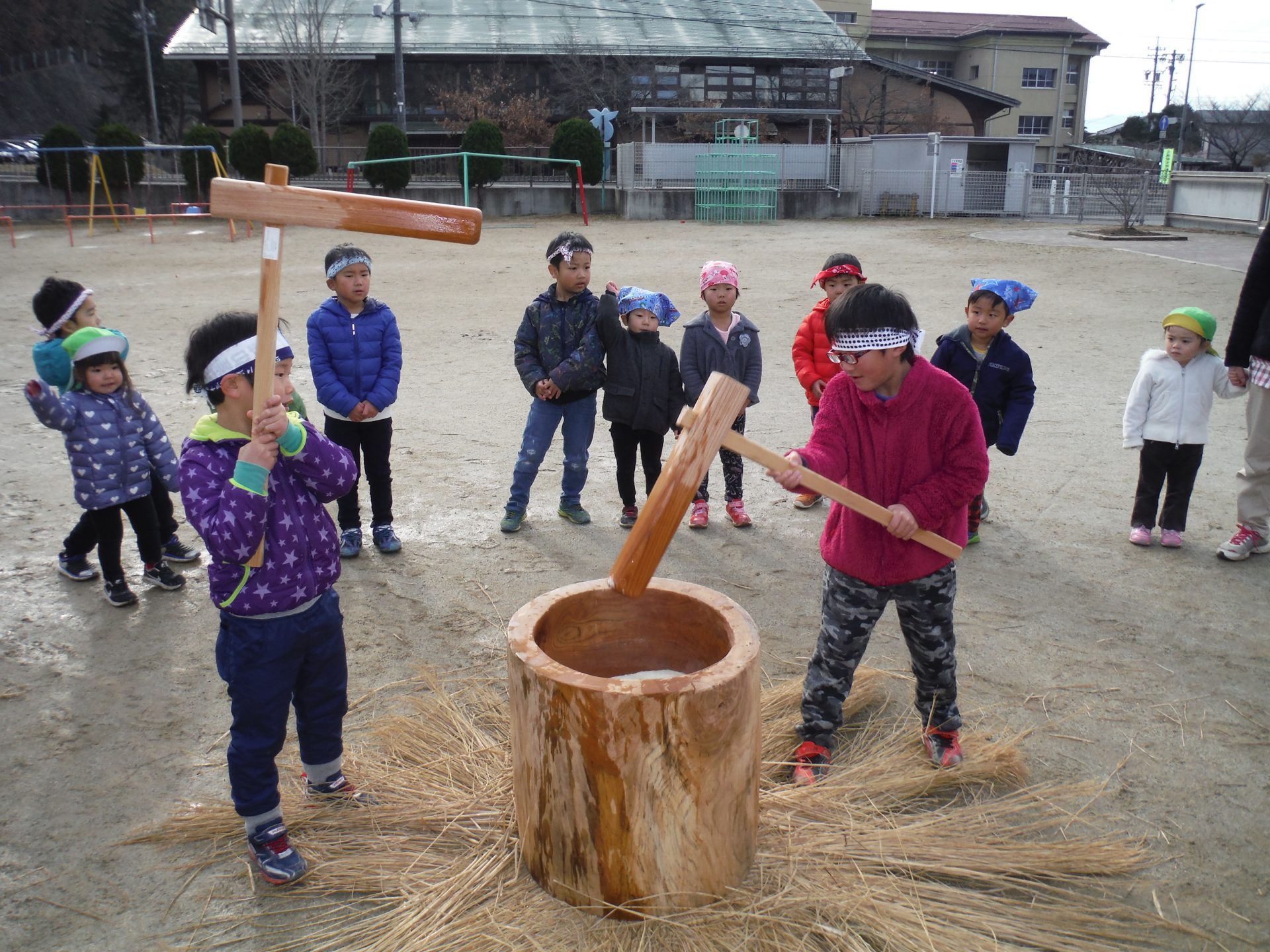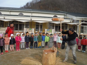おじいちゃん先生が力強くおもちをついてくれ、子どもたちも「よいしょっ」と大きなかけ声。