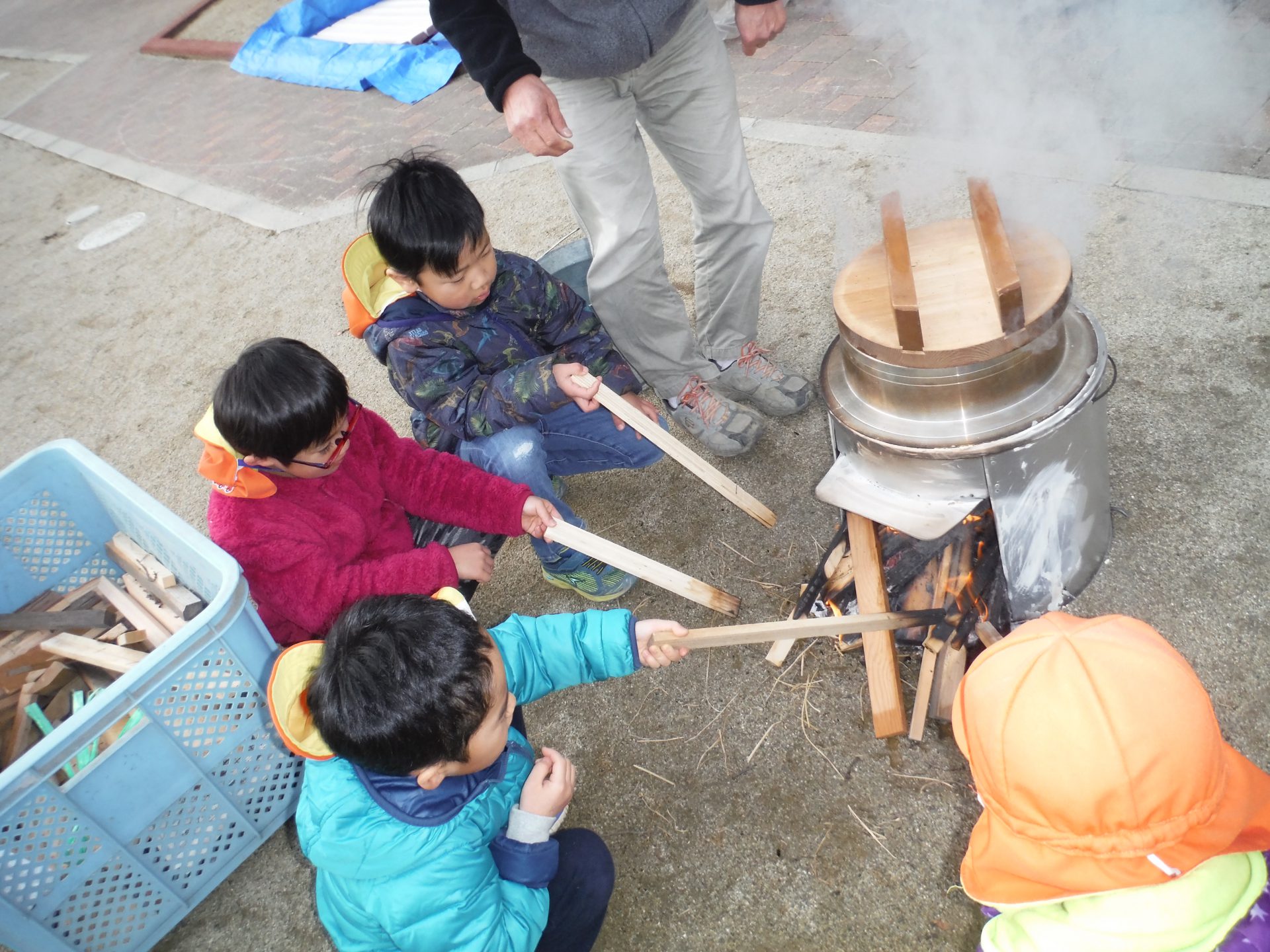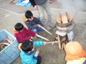 園長先生とおじいちゃん先生が朝から園庭で、もち米を蒸してくれるので年長さんはそのお手伝い。