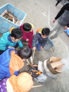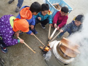 火おこしも園長先生やおじいちゃん先生に聞きながら貴重な体験ができた。