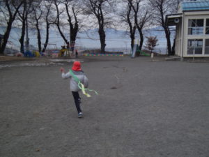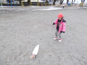 この時期ならではの遊びということで、子ども達と凧を作りました。とても寒い日でしたが、子ども達は寒さにも負けずに元気よく園庭を走り回っていました。(お友達同士近づきすぎて凧が絡まることもあり、なかなかほどくのが大変でした…)
