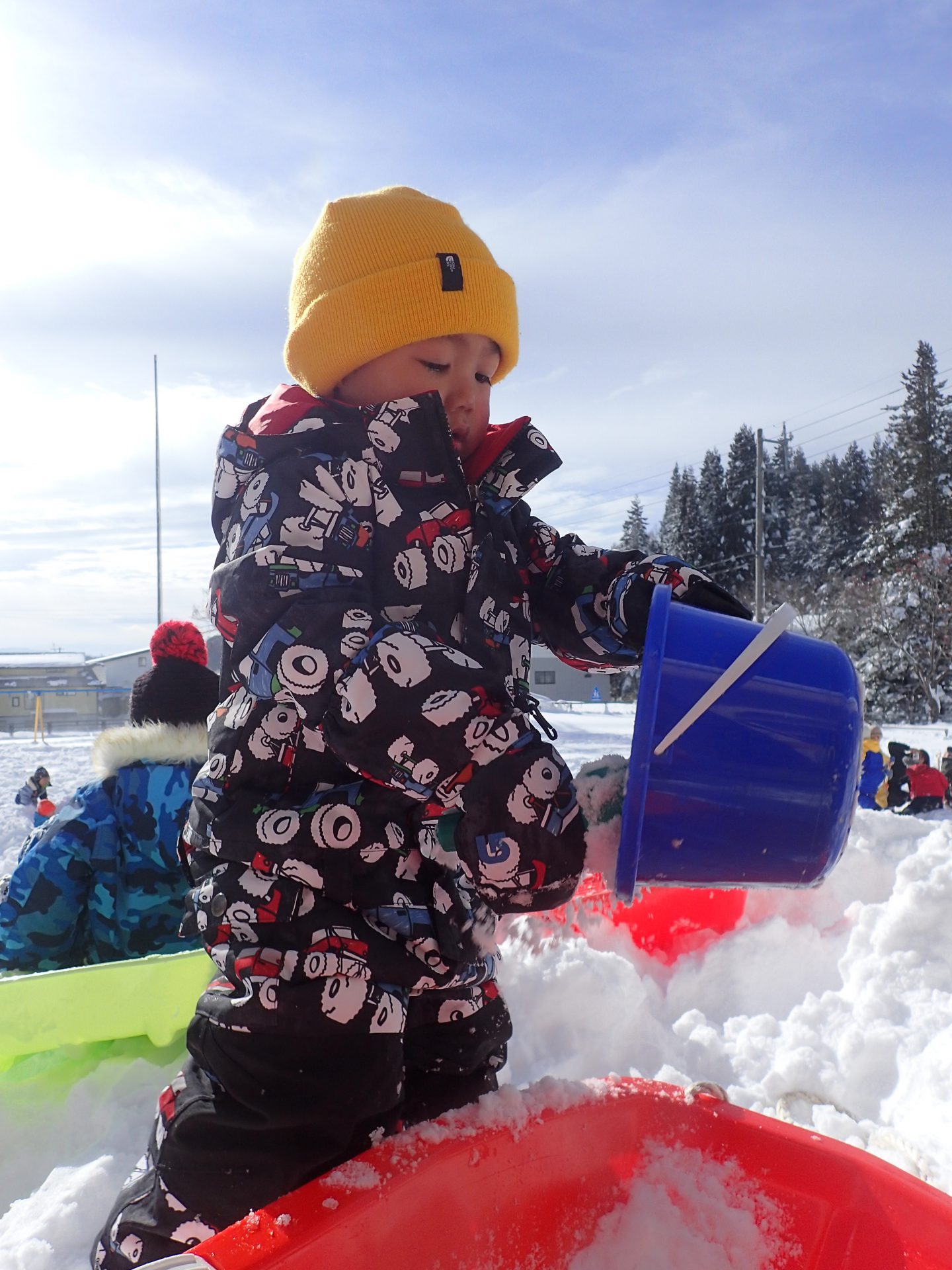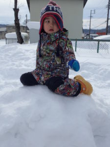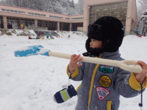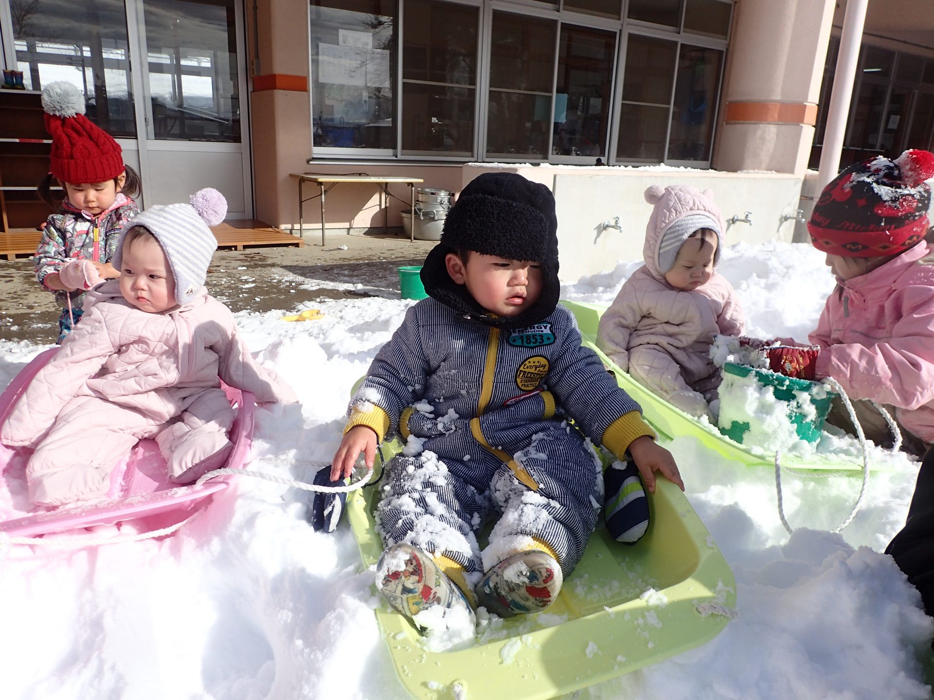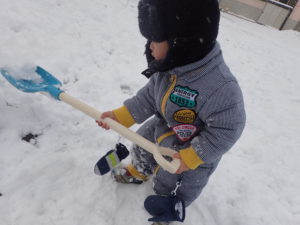 まだまだ動きのぎこちない未満児さん。慣れない服(ウエアー)、手袋をつけ更に動きにくくなるけれど・・興味のあるところへ行ったり、雪に触れてみたり、道具を使うなど好奇心と探求心に満ち溢れています。そしてたくさんの発見や気づきをしているんだろうなと感じます。