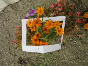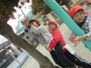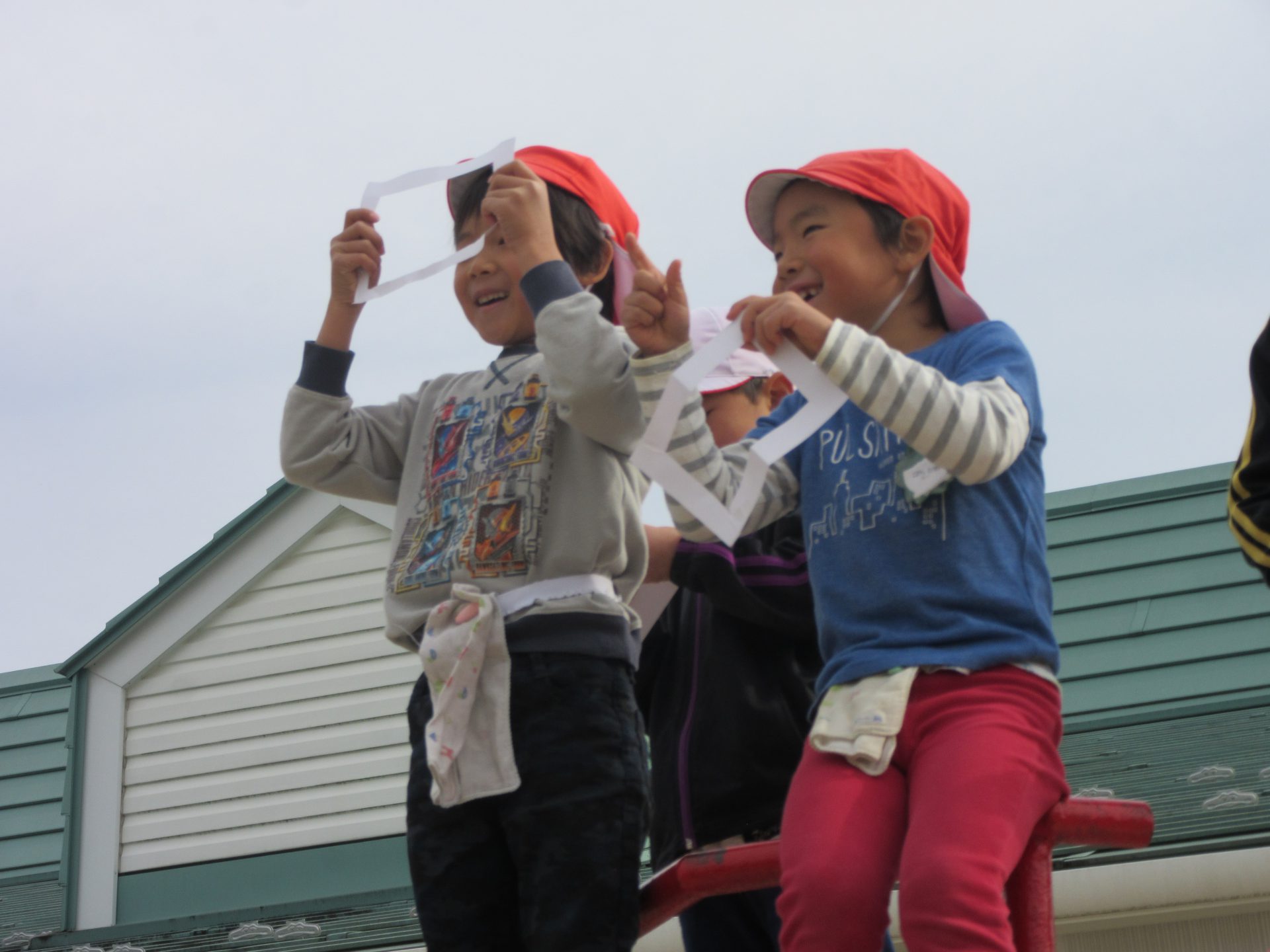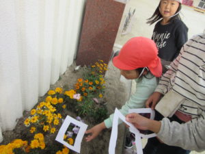 ・子どもたちと画用紙でフレームを作り、いつも遊んでいる園庭に出てみました。このフレームから覗いてみると、不思議!不思議!!いつも見ていたはずのものがとってもきれいに見えたり、素敵に見えると大発見でした。