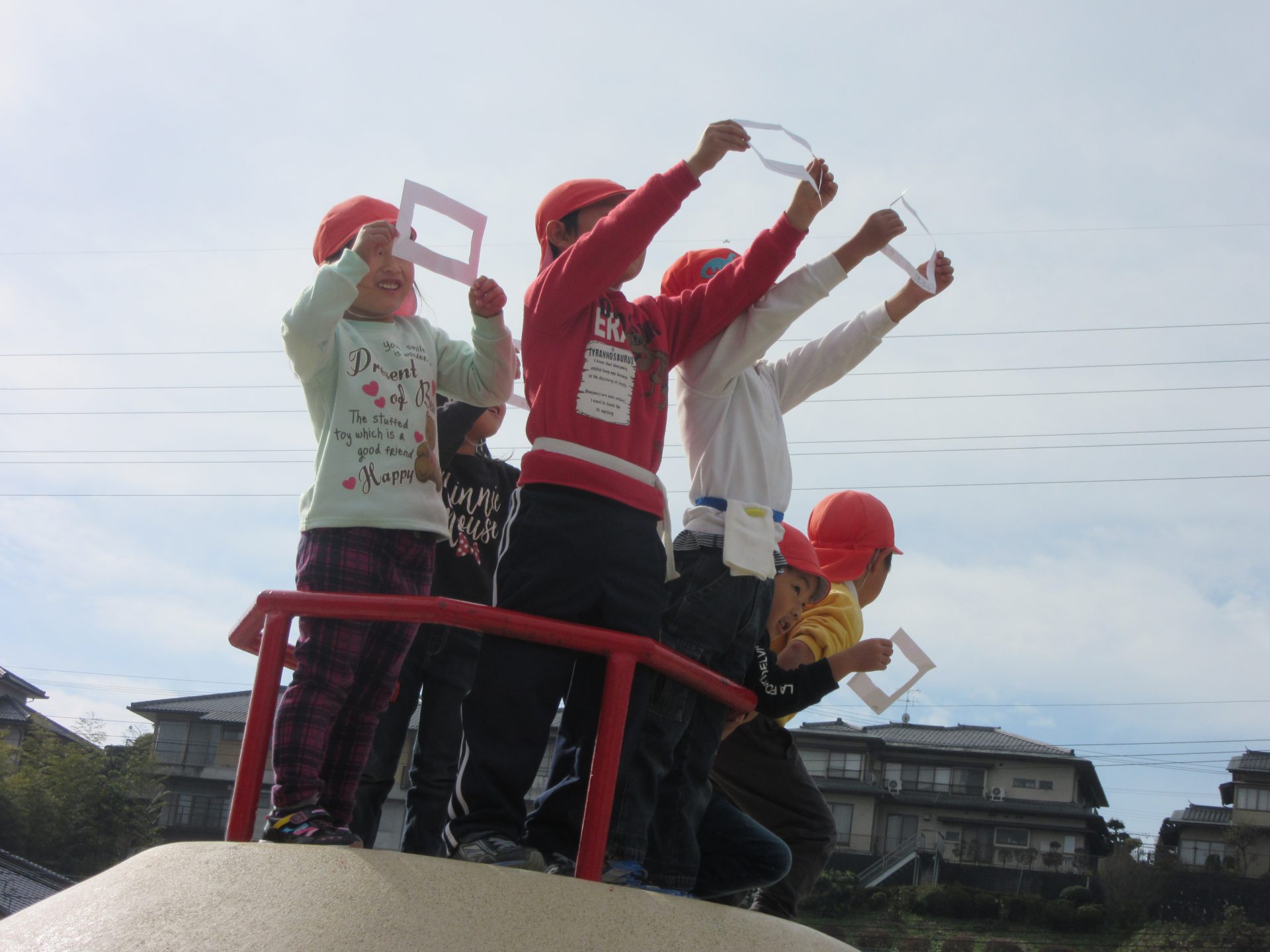 ・フレームを使って、大きなつるつる山のすべり台に上って権現山をみた子供たちは「うわー! すごい! 写真見たい!!」と驚いていました。