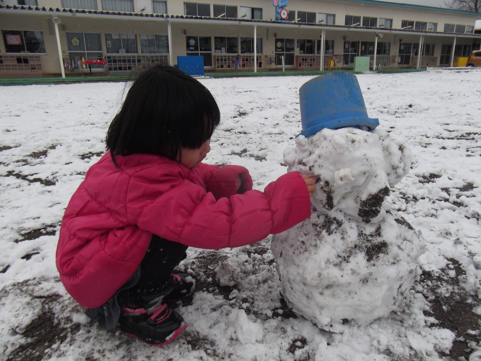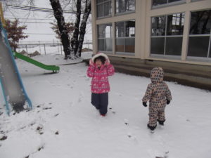 なかなか雪の降らなかった松本市ですが、今朝ようやく待望の雪が降りました。子ども達は喜んで、朝の支度が終わると園庭へかけ出していきました。