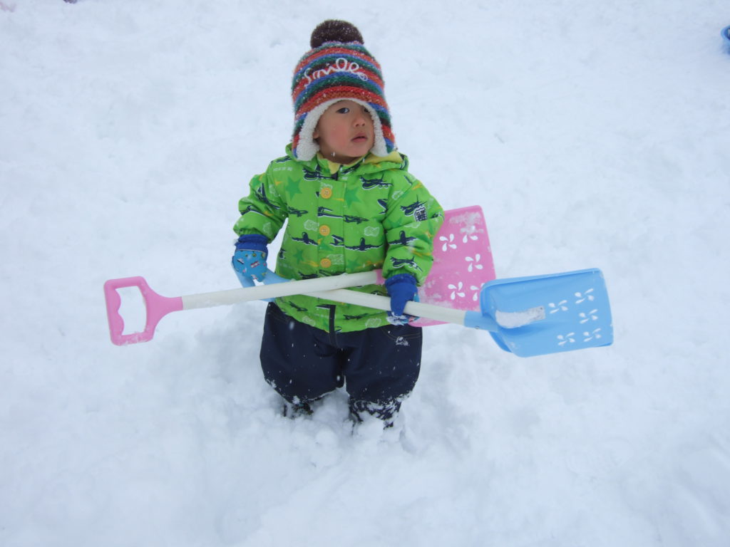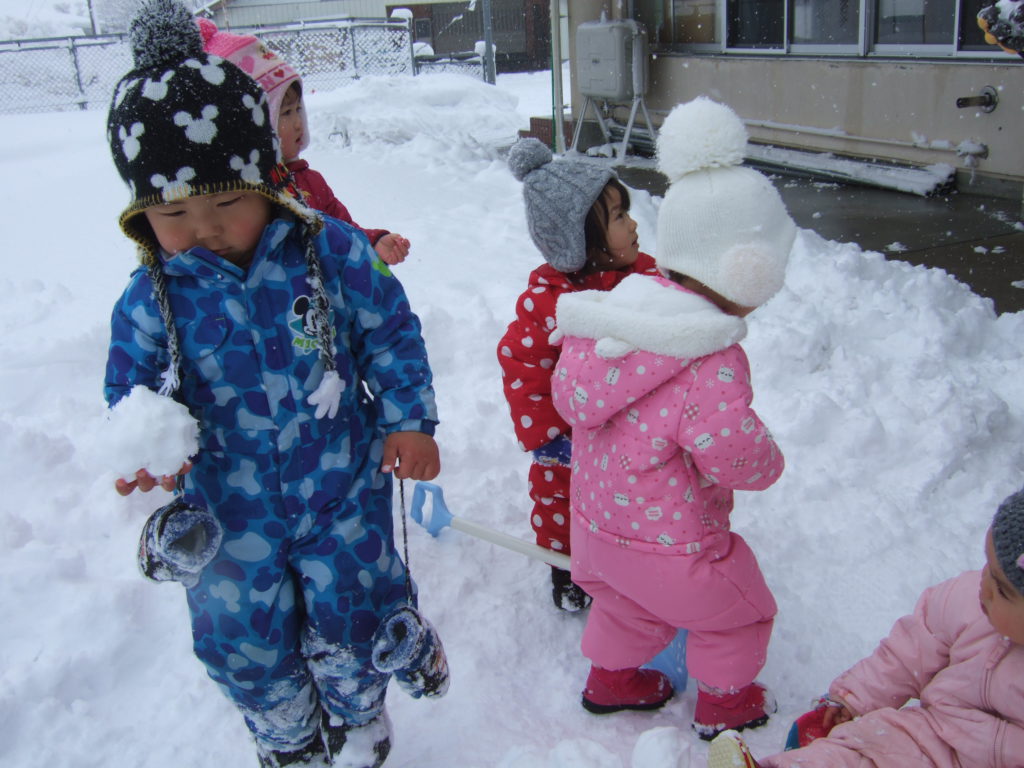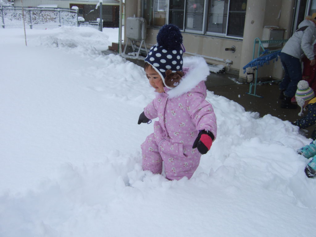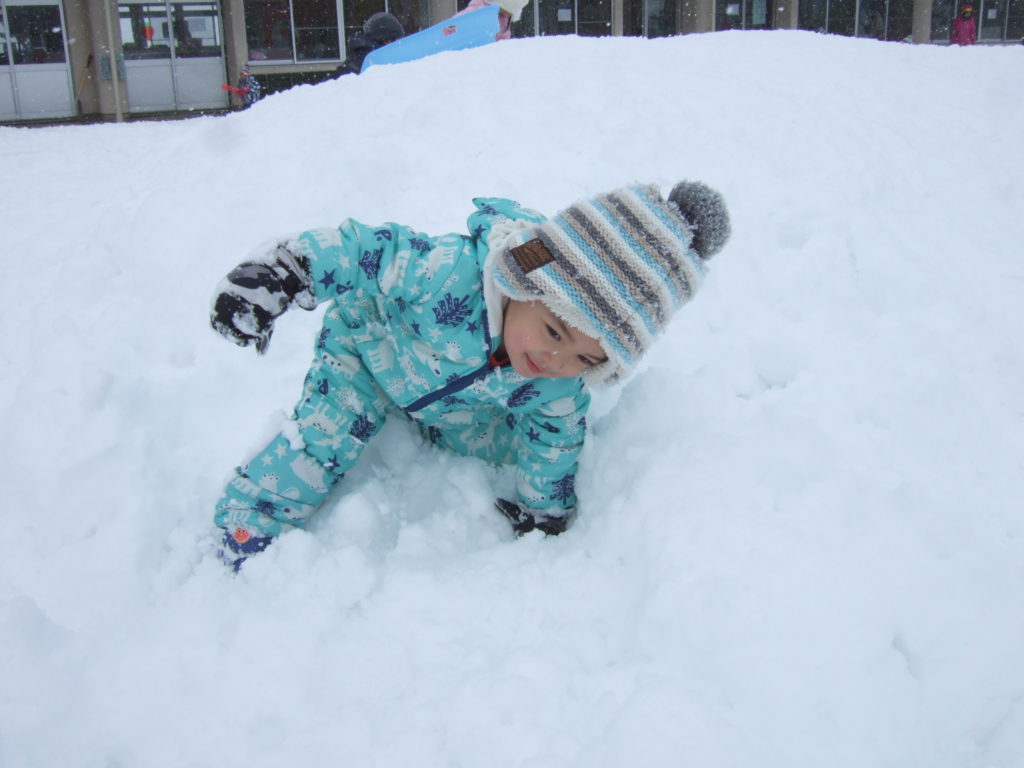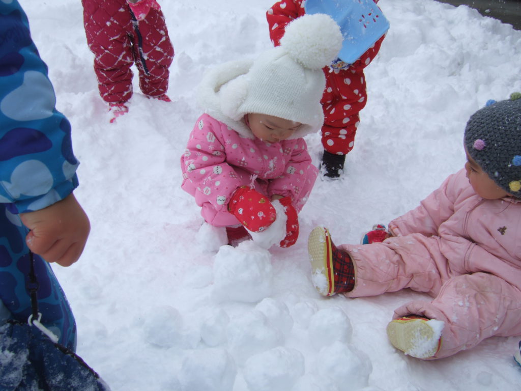 日に日に積雪が増えてきた園庭。お日様が出ている晴れの日の雪遊びは雪の冷たさも平気!ですが曇りの日は雪の冷たさにも抵抗を示したり、その日の天気によっても子どもの雪との関わり方が違います。雪は、固まりやすかったり、ふわふわしてたり、子どもにとって思わぬ発見をもたらす遊びの素材のひとつです。子ども達がいろいろな方法で自ら触れたり、関わったり、その変化や手応えを楽しめるような環境を用意していこうと思います。また、子どもがじっくりと雪に関わり、様々な発見や気づきの喜びを経験するために、雪遊びの時間を十分にとっていこうと思います。気温や、体調などに配慮しながら冬ならではの雪遊びを経験していきたいです。