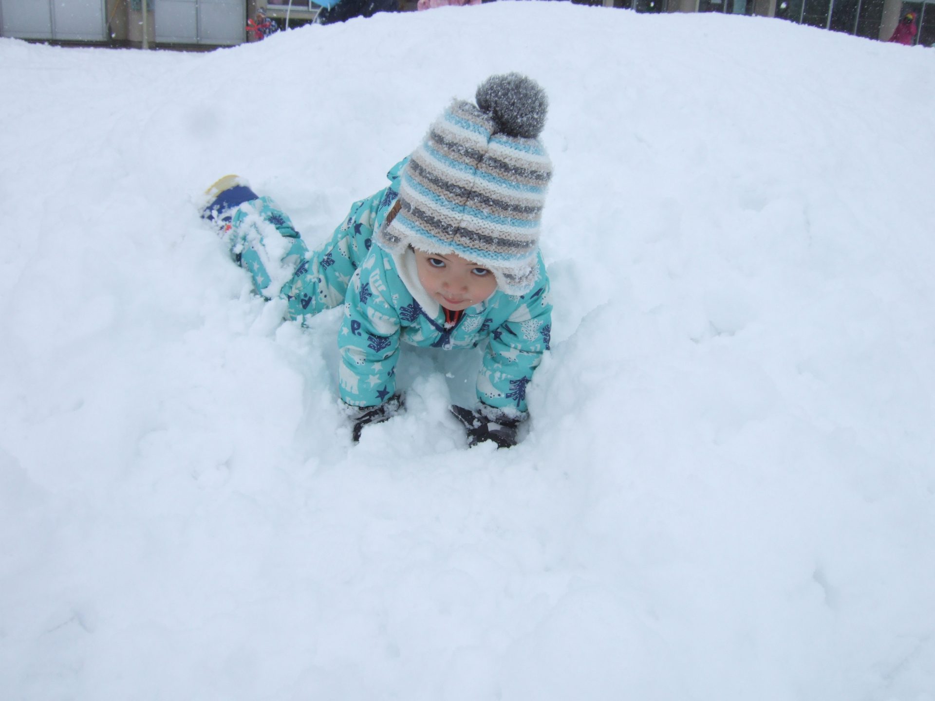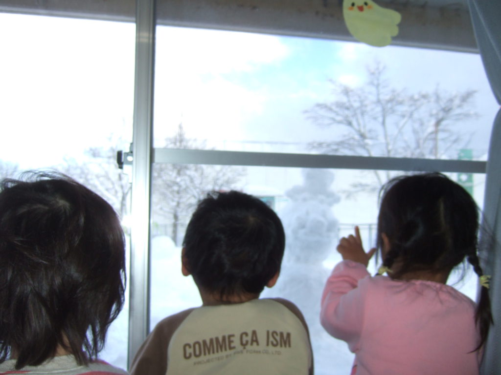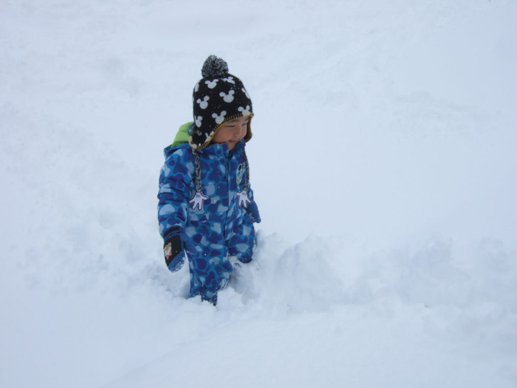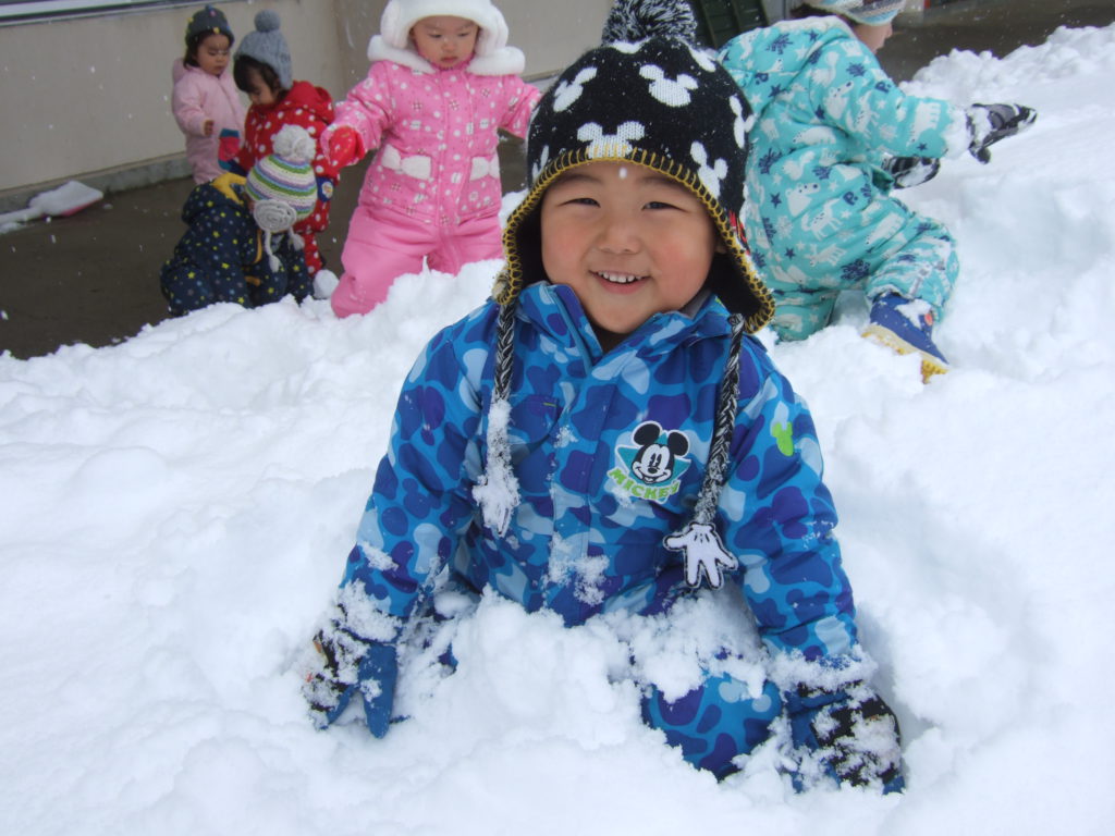 日に日に積雪が増えてきた園庭。お日様が出ている晴れの日の雪遊びは雪の冷たさも平気!ですが曇りの日は雪の冷たさにも抵抗を示したり、その日の天気によっても子どもの雪との関わり方が違います。雪は、固まりやすかったり、ふわふわしてたり、子どもにとって思わぬ発見をもたらす遊びの素材のひとつです。子ども達がいろいろな方法で自ら触れたり、関わったり、その変化や手応えを楽しめるような環境を用意していこうと思います。また、子どもがじっくりと雪に関わり、様々な発見や気づきの喜びを経験するために、雪遊びの時間を十分にとっていこうと思います。気温や、体調などに配慮しながら冬ならではの雪遊びを経験していきたいです。