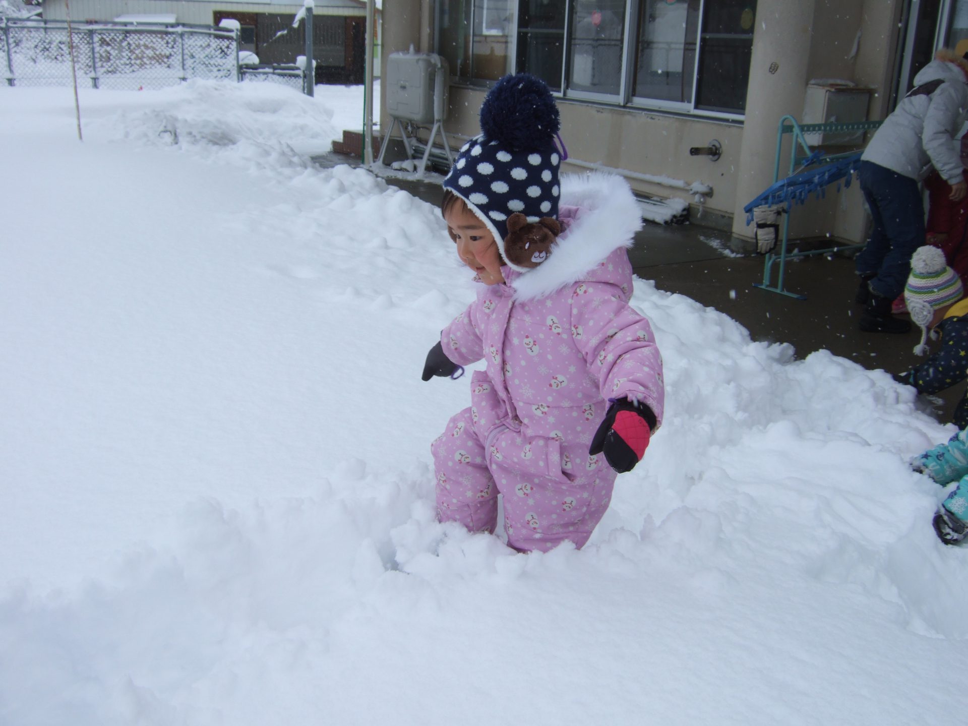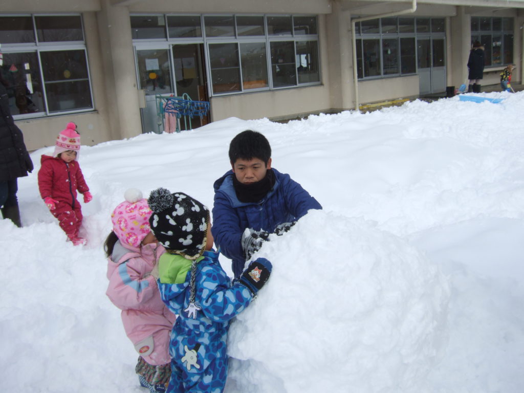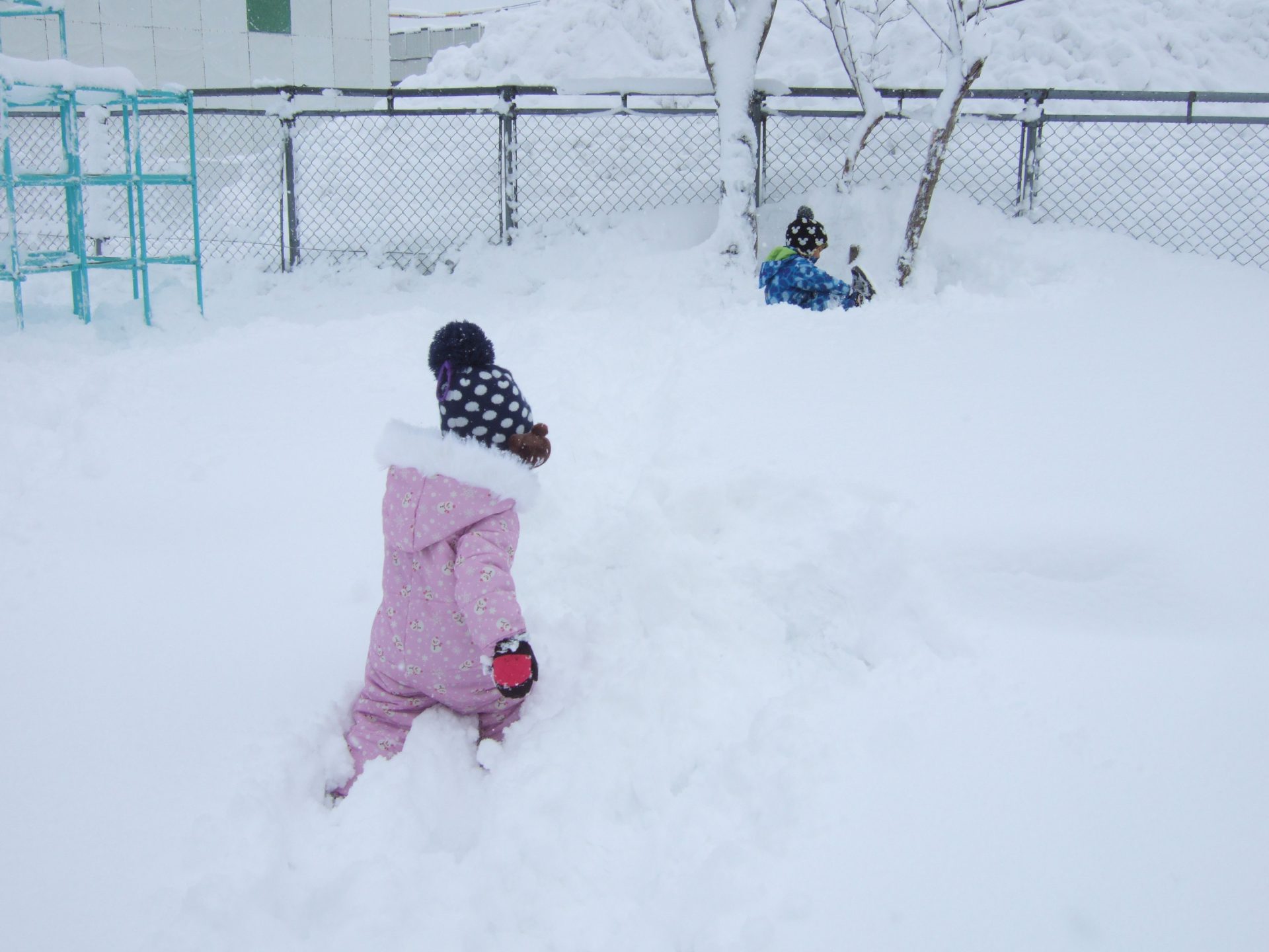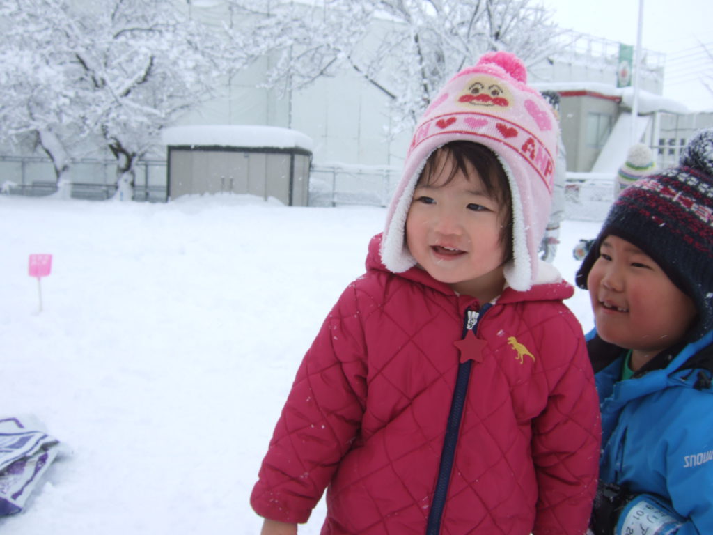前日から降り続いた雪で園庭はふかふかの新雪が広がっていました。