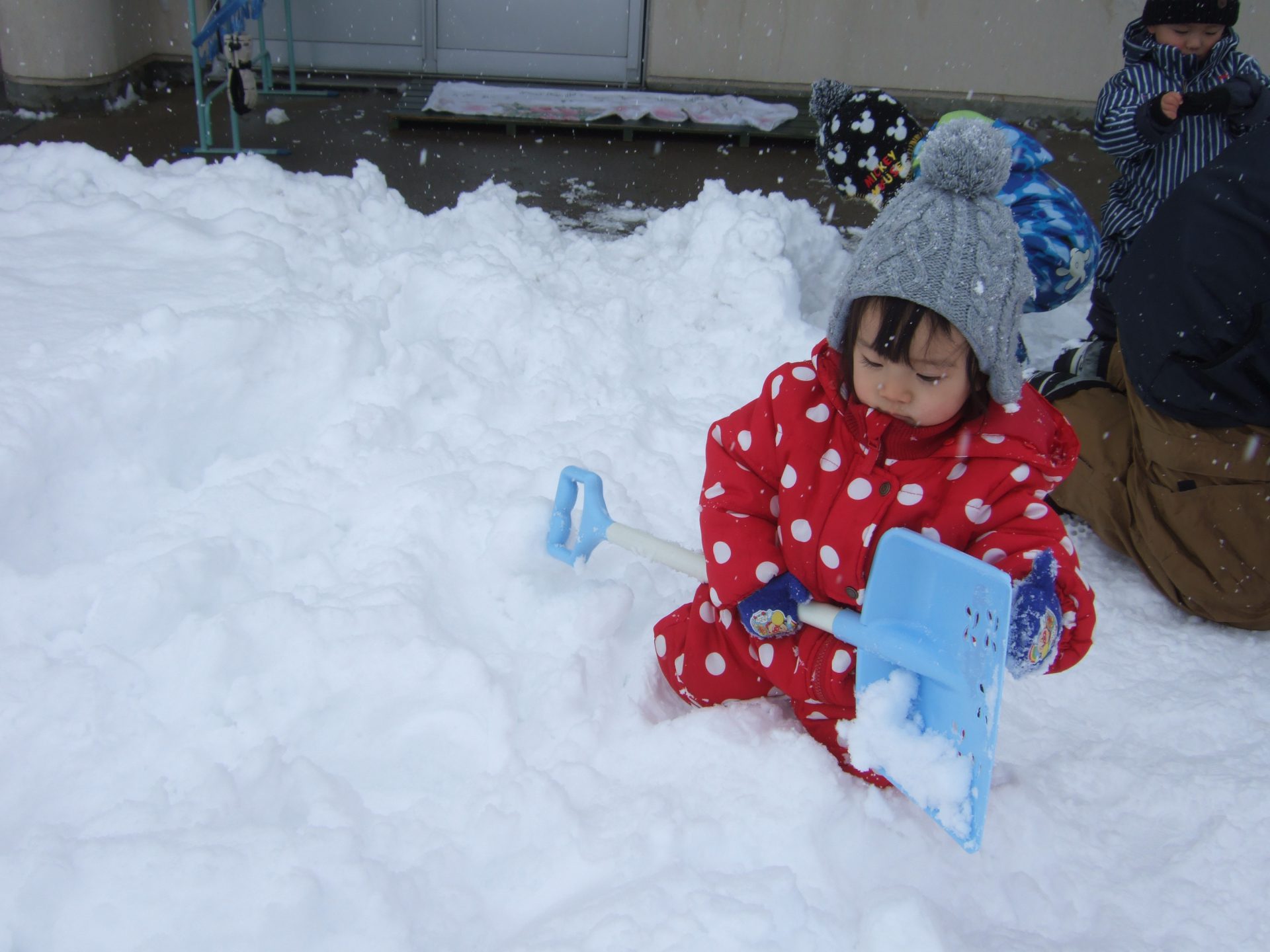 自分で扱うのは難しいですが、幼児組のお友達を真似てシャベルを持っているお友達もいましたよ。