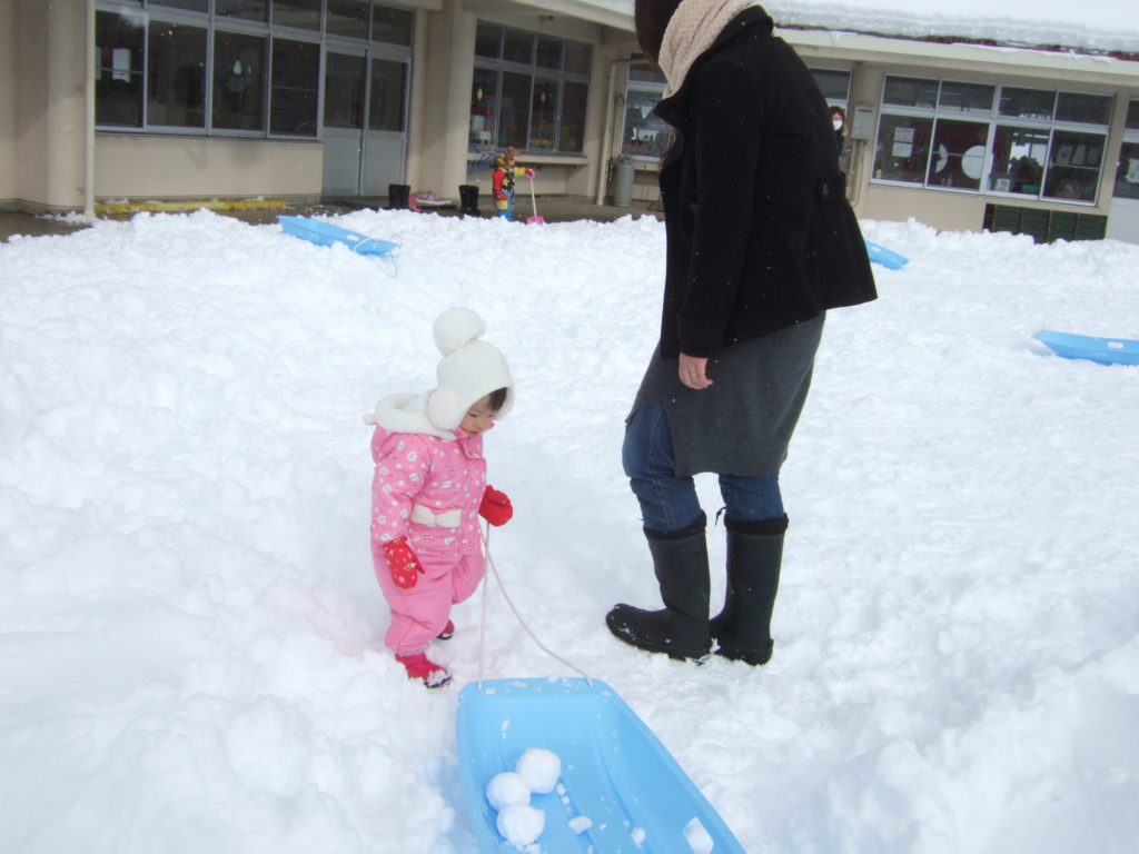 そりに雪玉を入れて雪の上をお散歩!