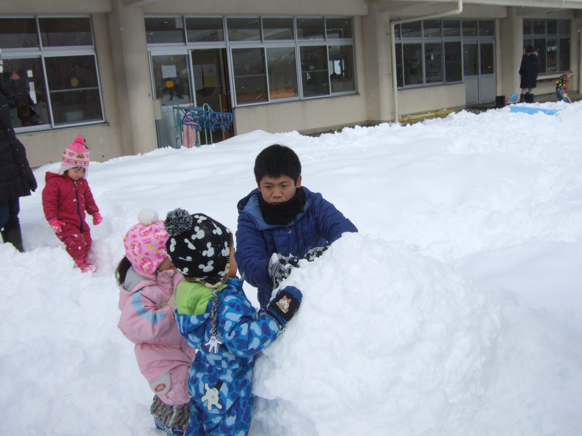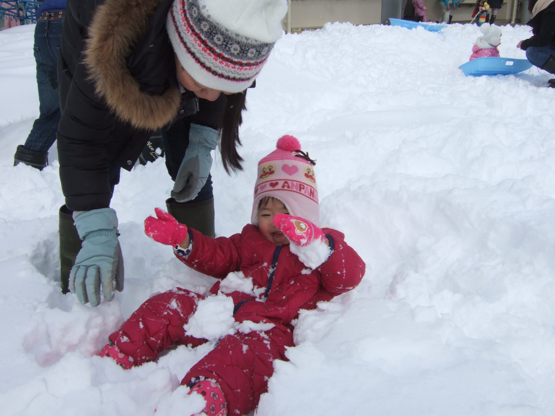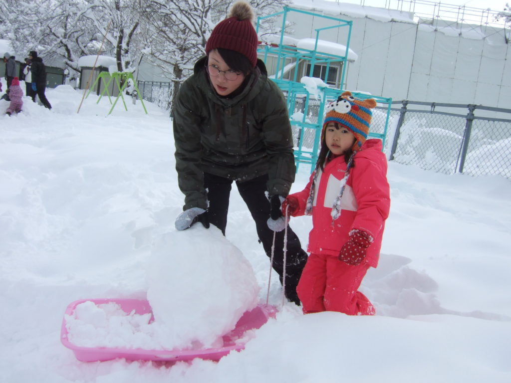 先日の保育参観では、お家の方と一緒に雪遊びを楽しみました。