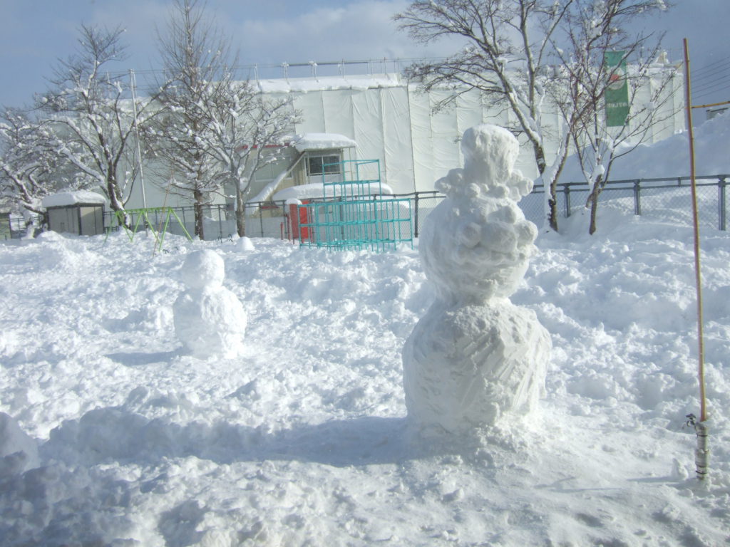 高くて危ないかな、と心配してもらい二段の雪だるまに変身しました。