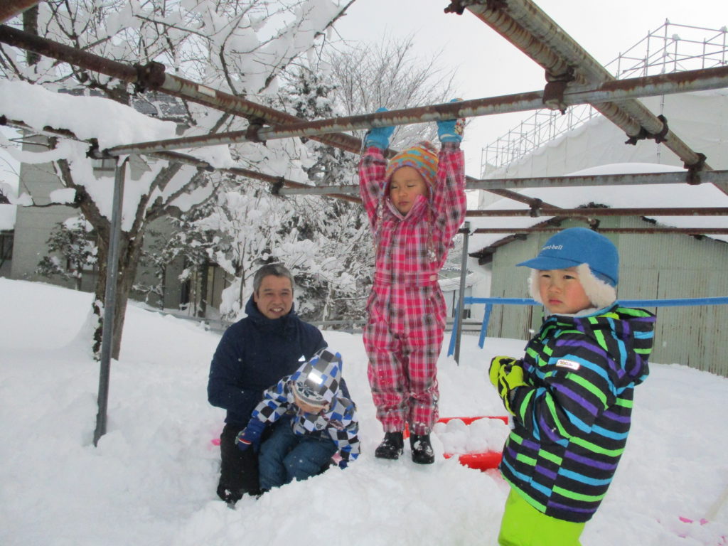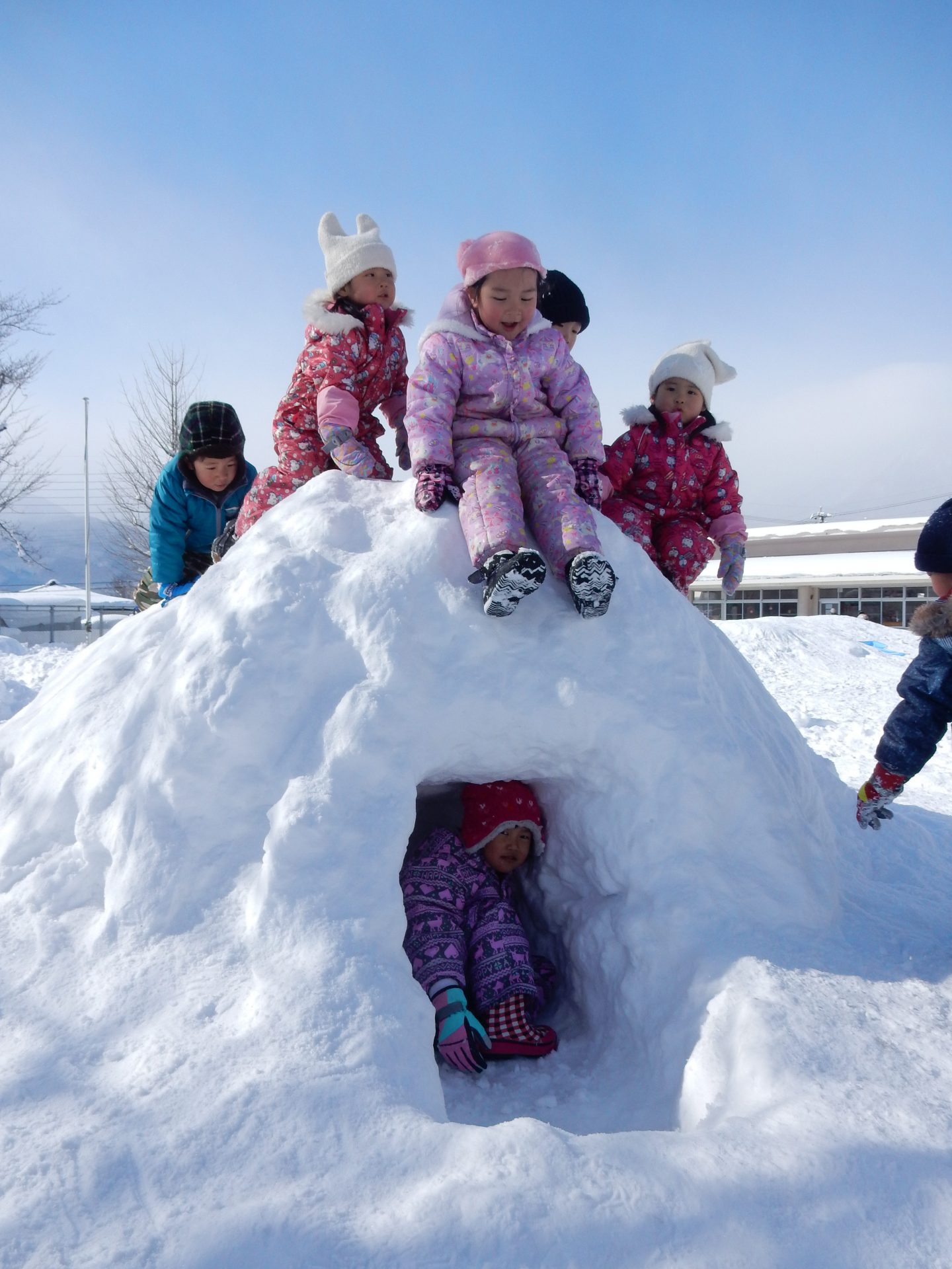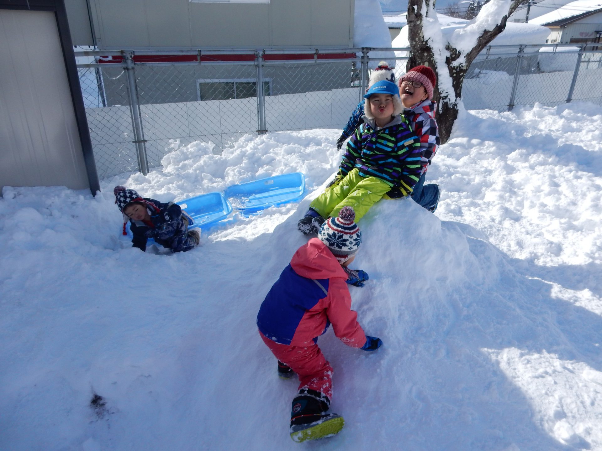 信濃町の冬はまだまだ続きます。園庭いっぱいの雪で‘雪遊び’と一言で言っても遊び方や遊びの広がり方、子ども達の発見がたくさんあるんだな〜と子ども達の遊びを見て驚かされます。