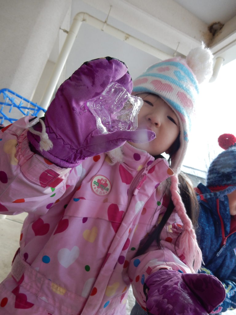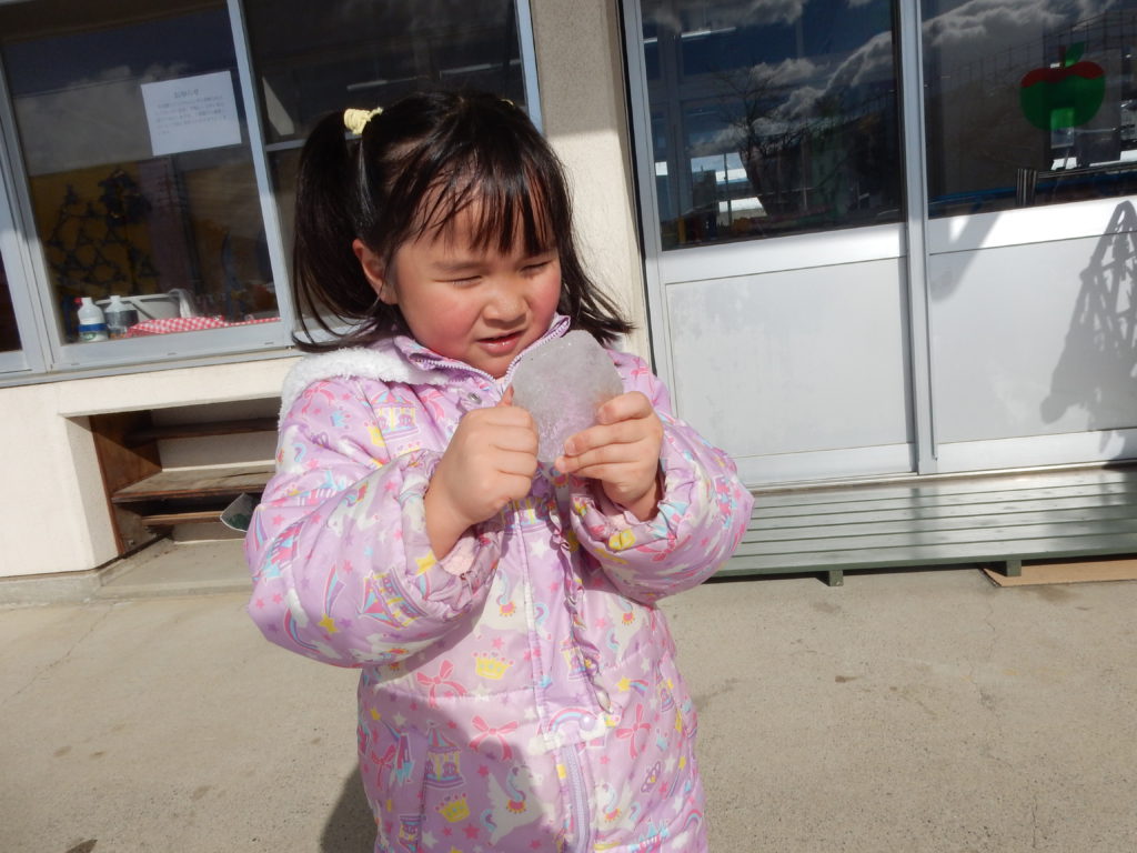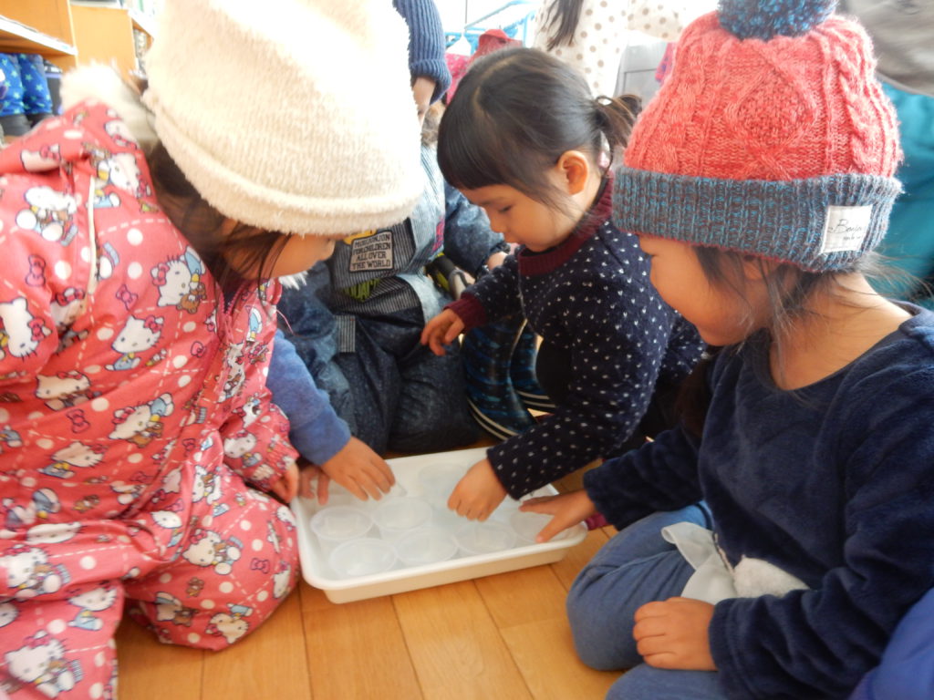 その後、朝晩の気温によっては、氷が薄かったり、すぐに割れてしまったり、まだ水が残っていたり、「今日はまだ水が下の方にあるよ。」「今日は何ですぐに割れちゃうんだろう?」と子ども達は疑問でいっぱいです。