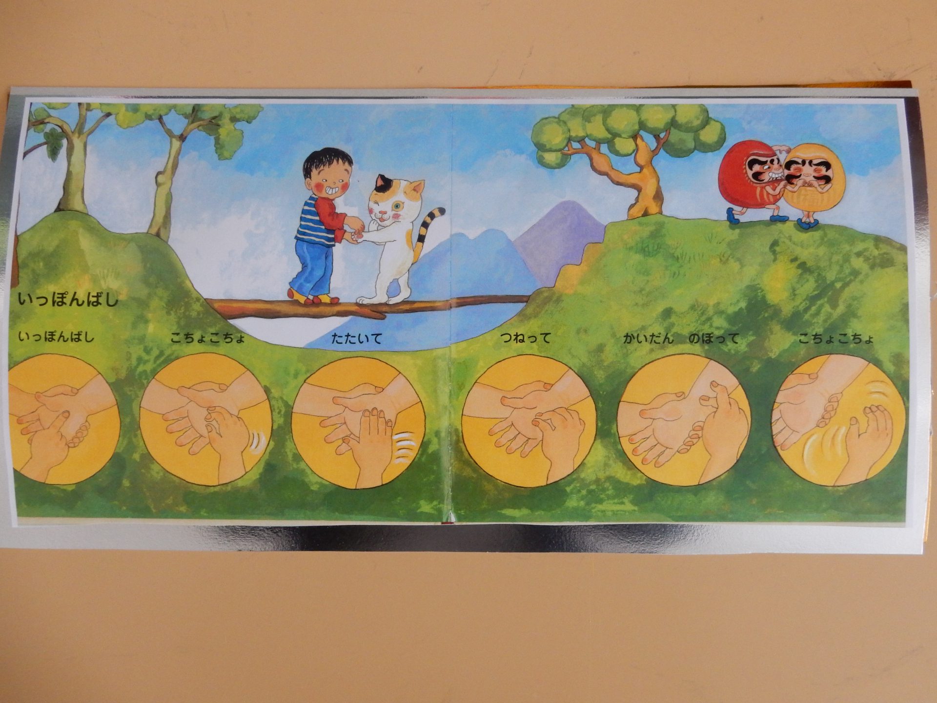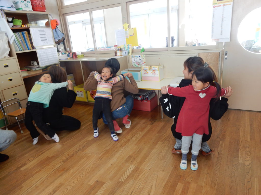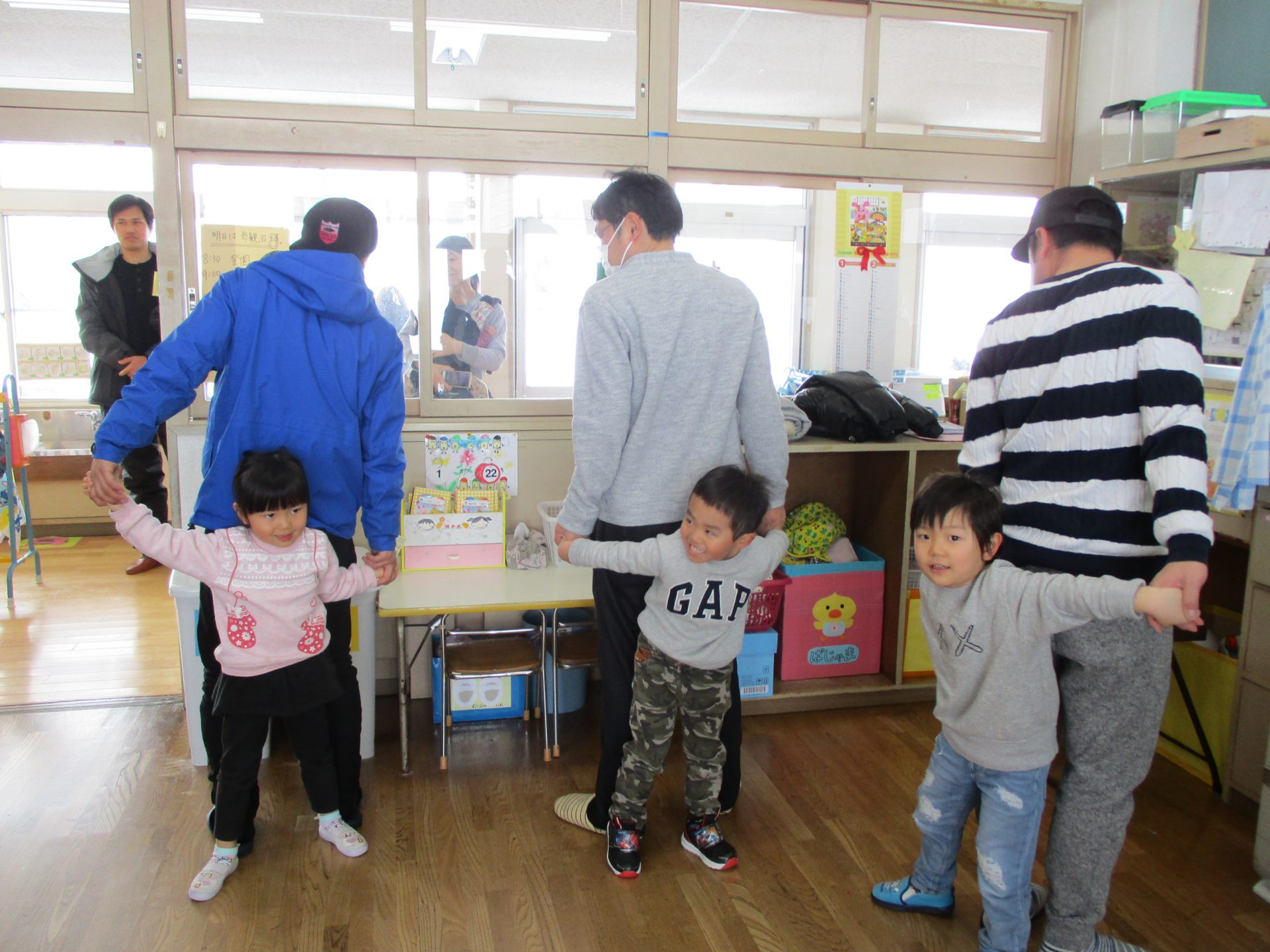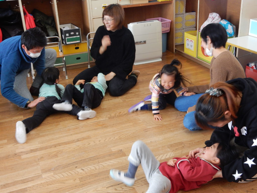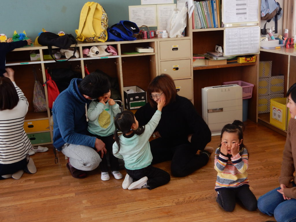 「明日はどんなところをお家の人に見てもらおうか?」の問いかけに、片付けをいつも以上に頑張るお友だち。歌を歌うと「このお歌も聞いてほしいな」というお友だち。座る姿勢もいつもよりもキリッとしていました。最近好きなわらべうたあそび、「この遊びを明日はお家の人とできるんだよ」と伝えると「わ〜い」と笑顔があふれました。