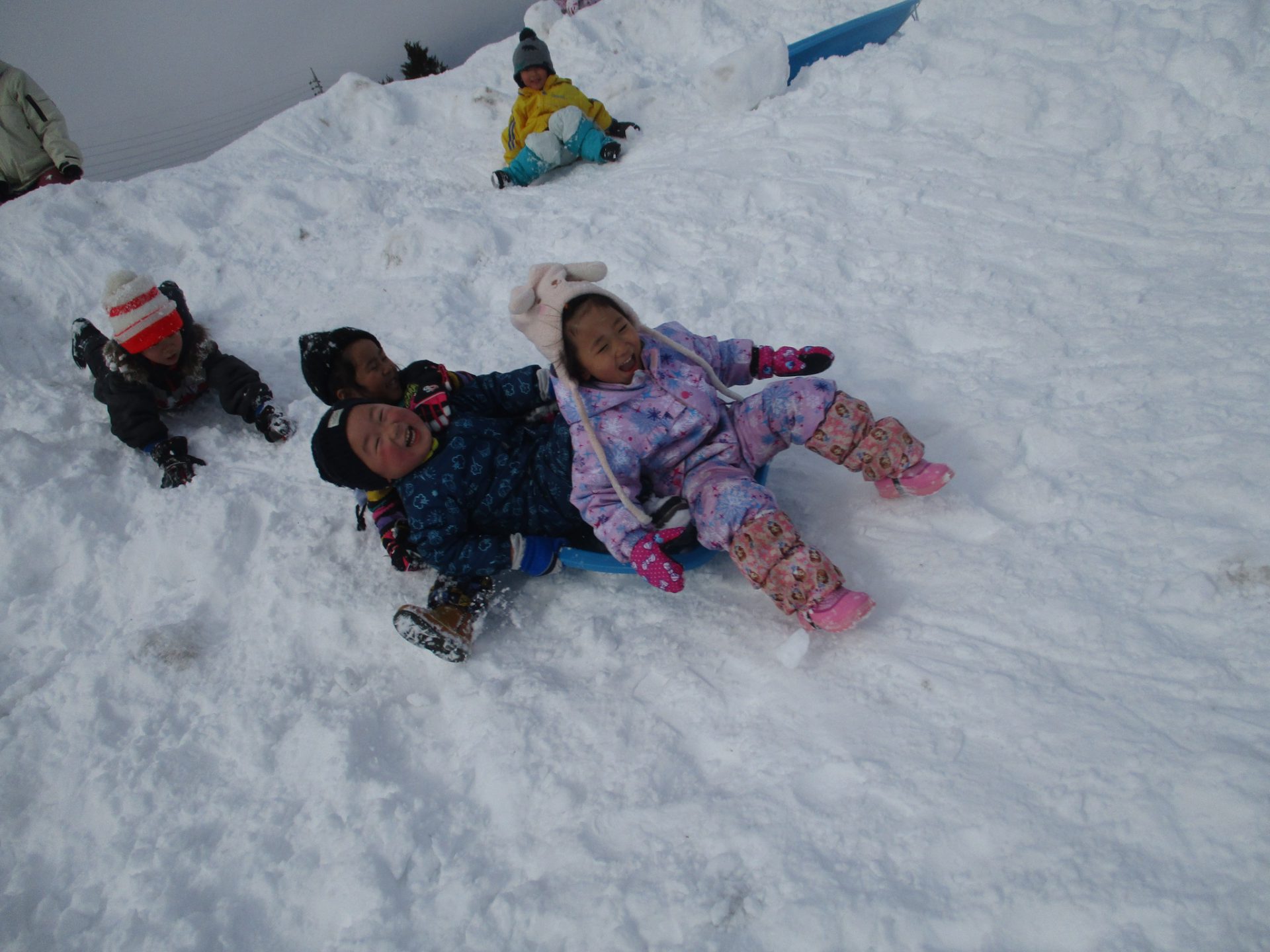 そりもいいけどお腹もよくすべる!つるつるした素材のスキーウエァがよくすべることを発見した子ども達。