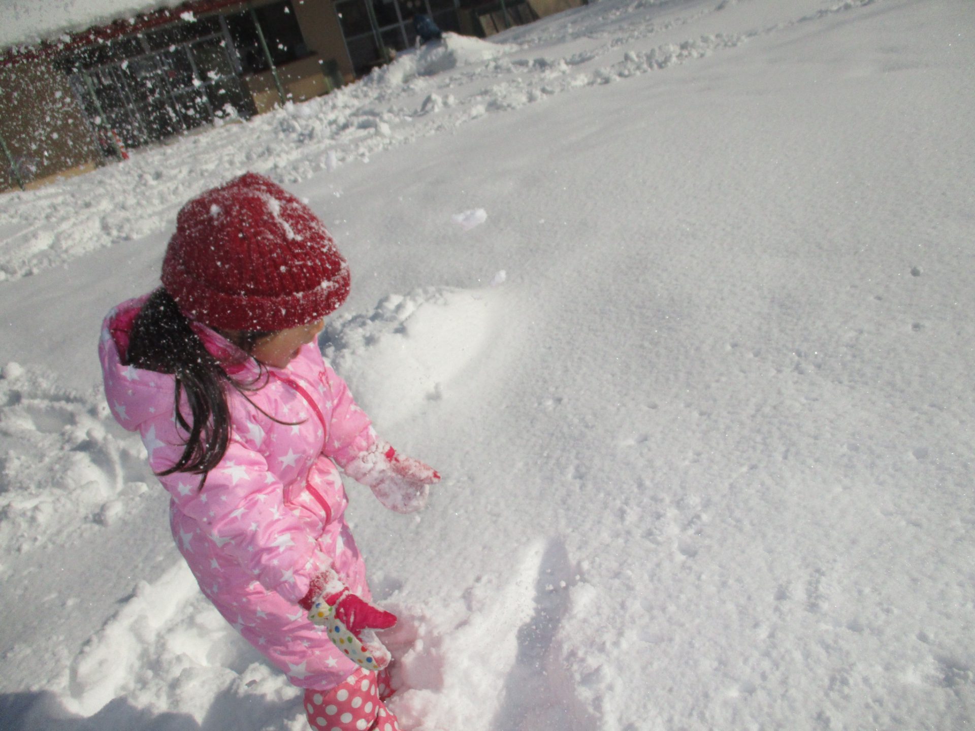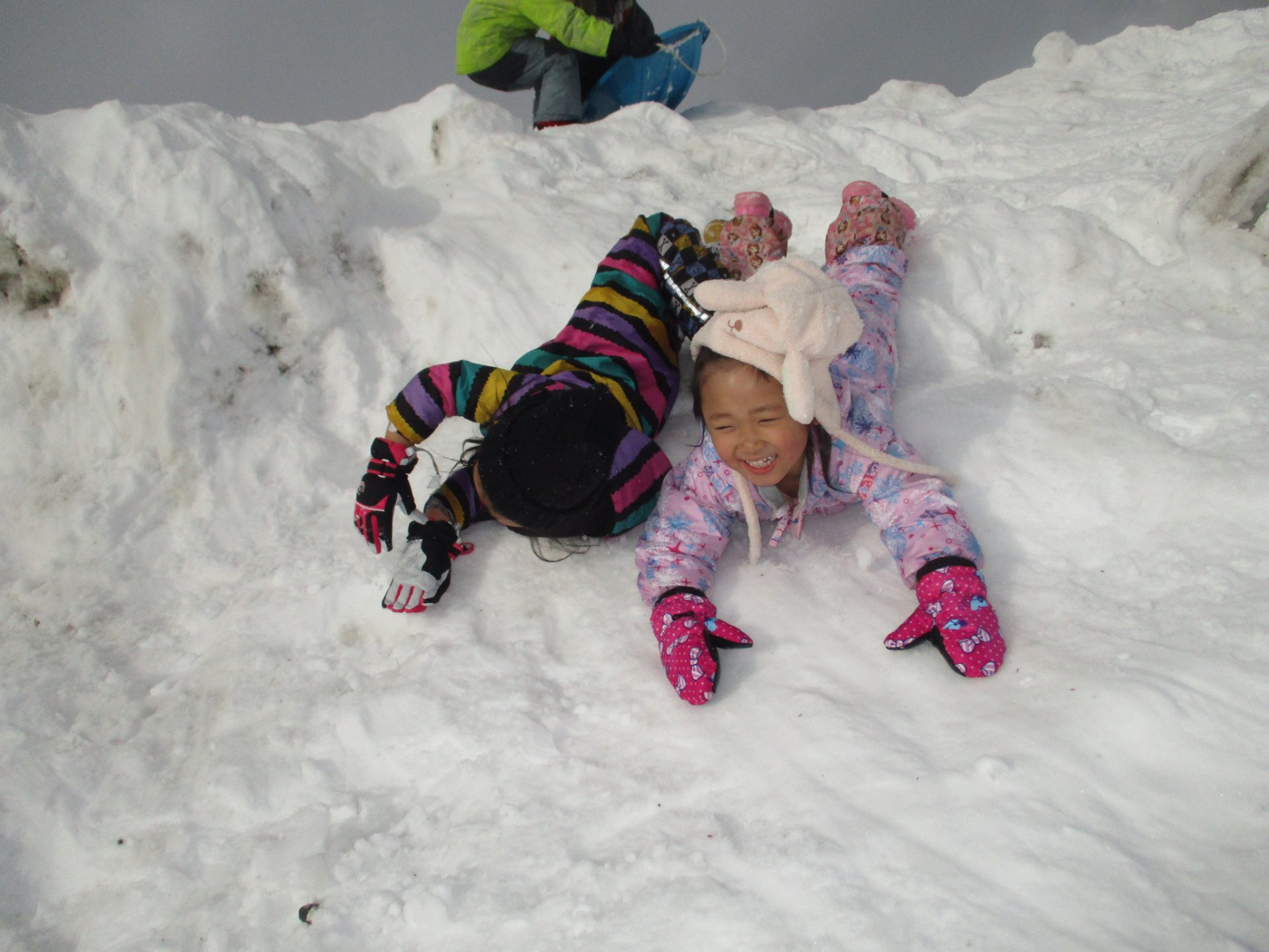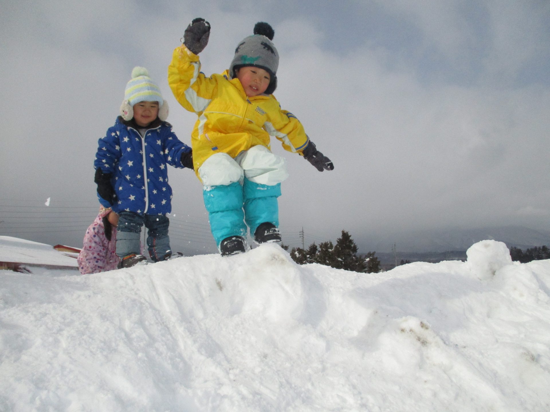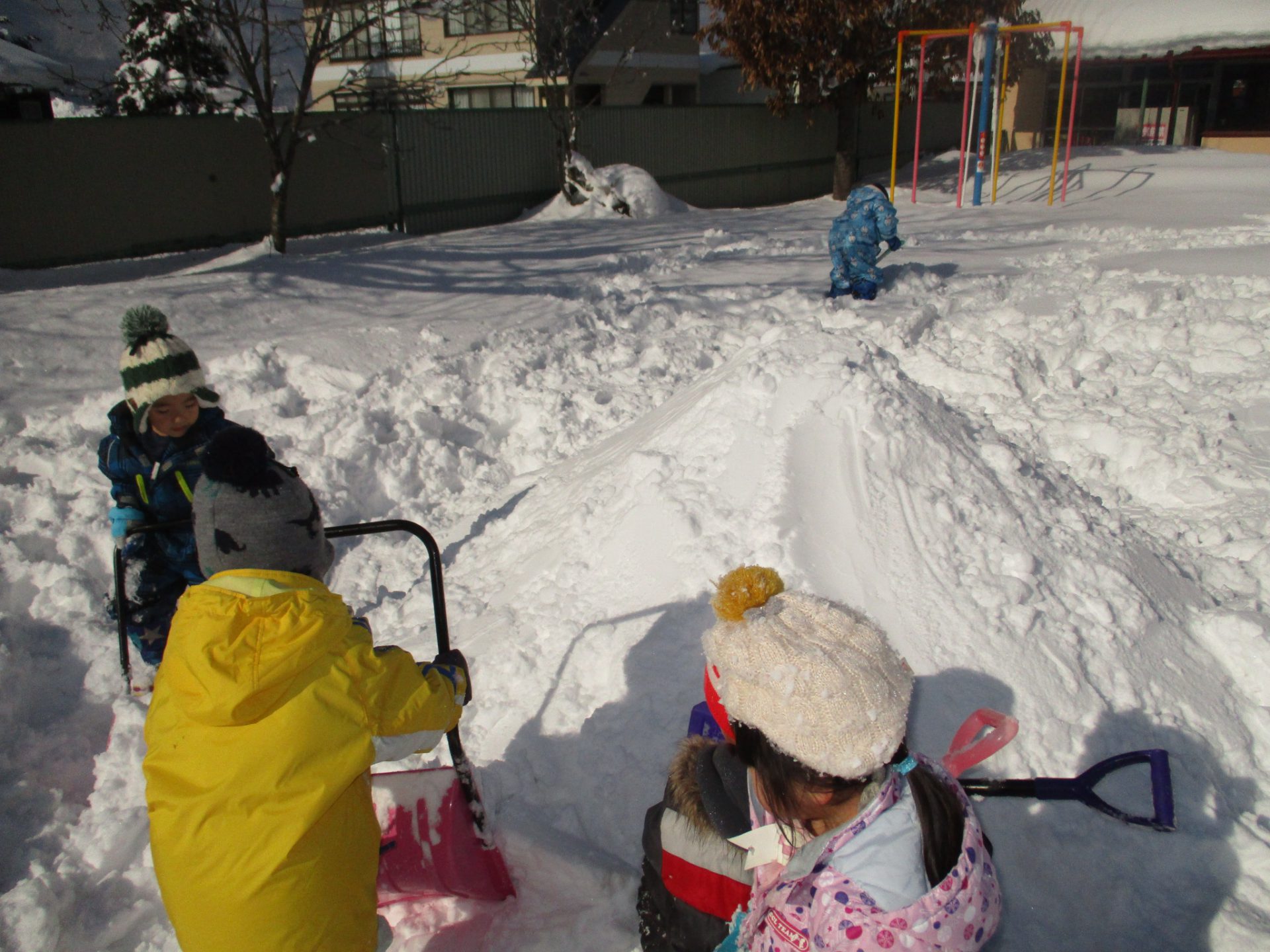 先日、年中・年長組の雪遊びの様子をご紹介したので、今回は未満・年少組の様子をご紹介します。