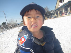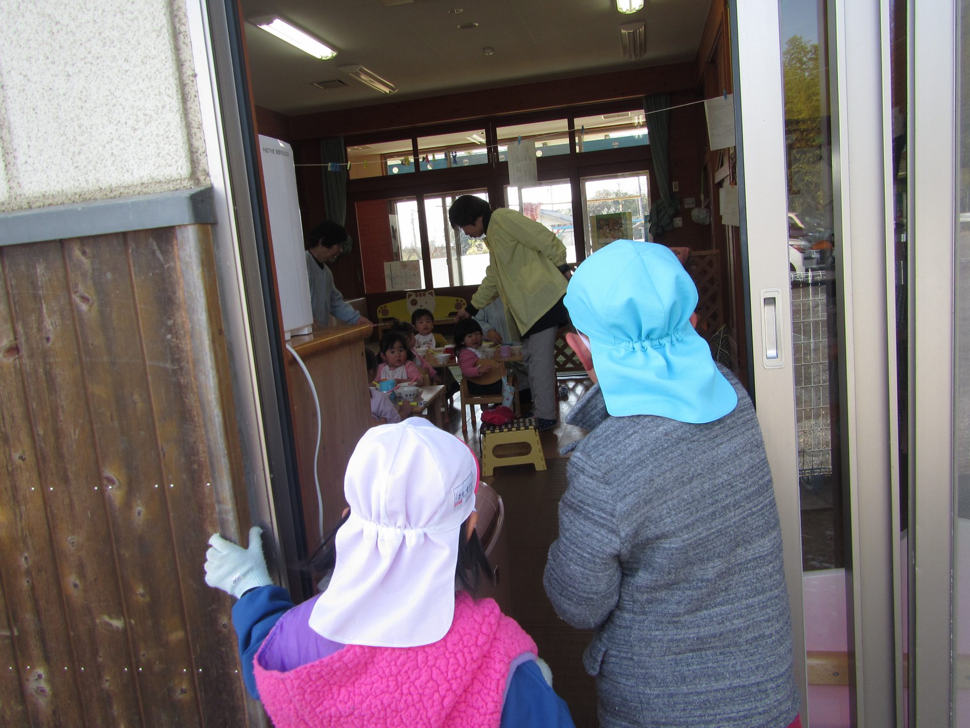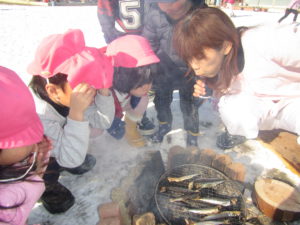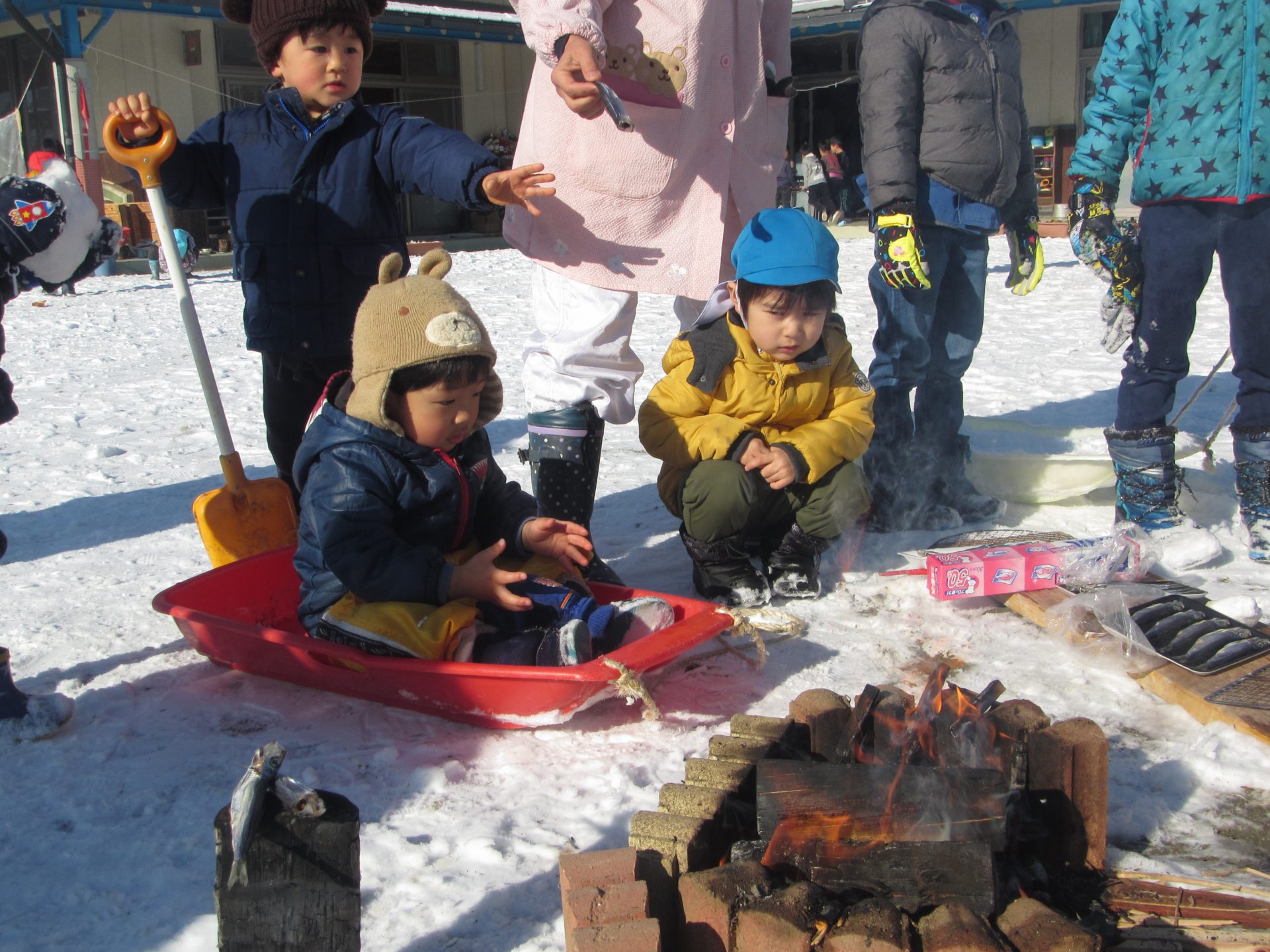 何だかいい匂いがするよ雪遊びの途中でも2歳児さんが集まってきました。