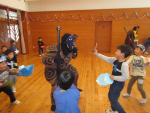 子どもたちの元気な声に誘われてやってきたのか、鬼が4匹山から下りてきた