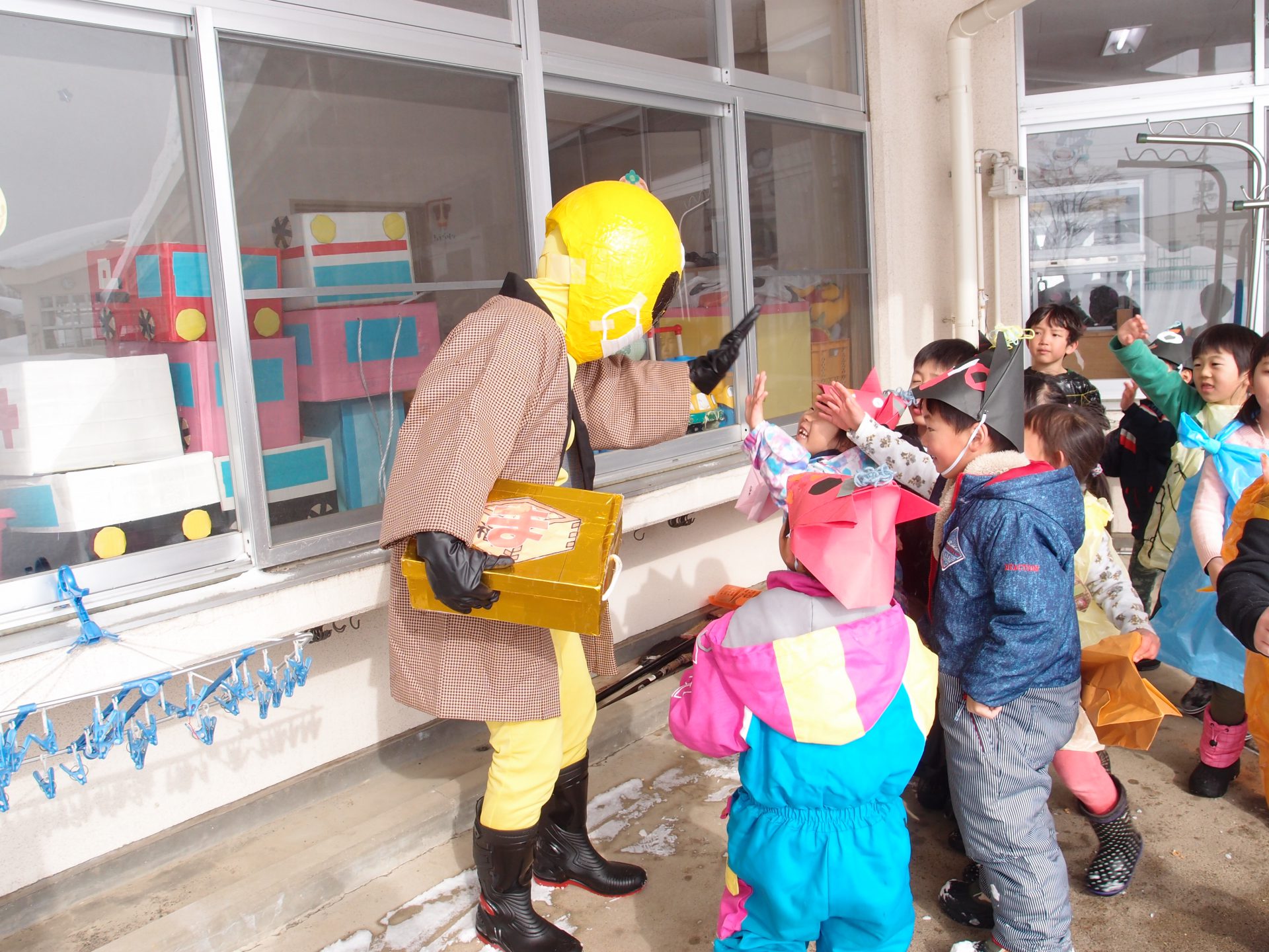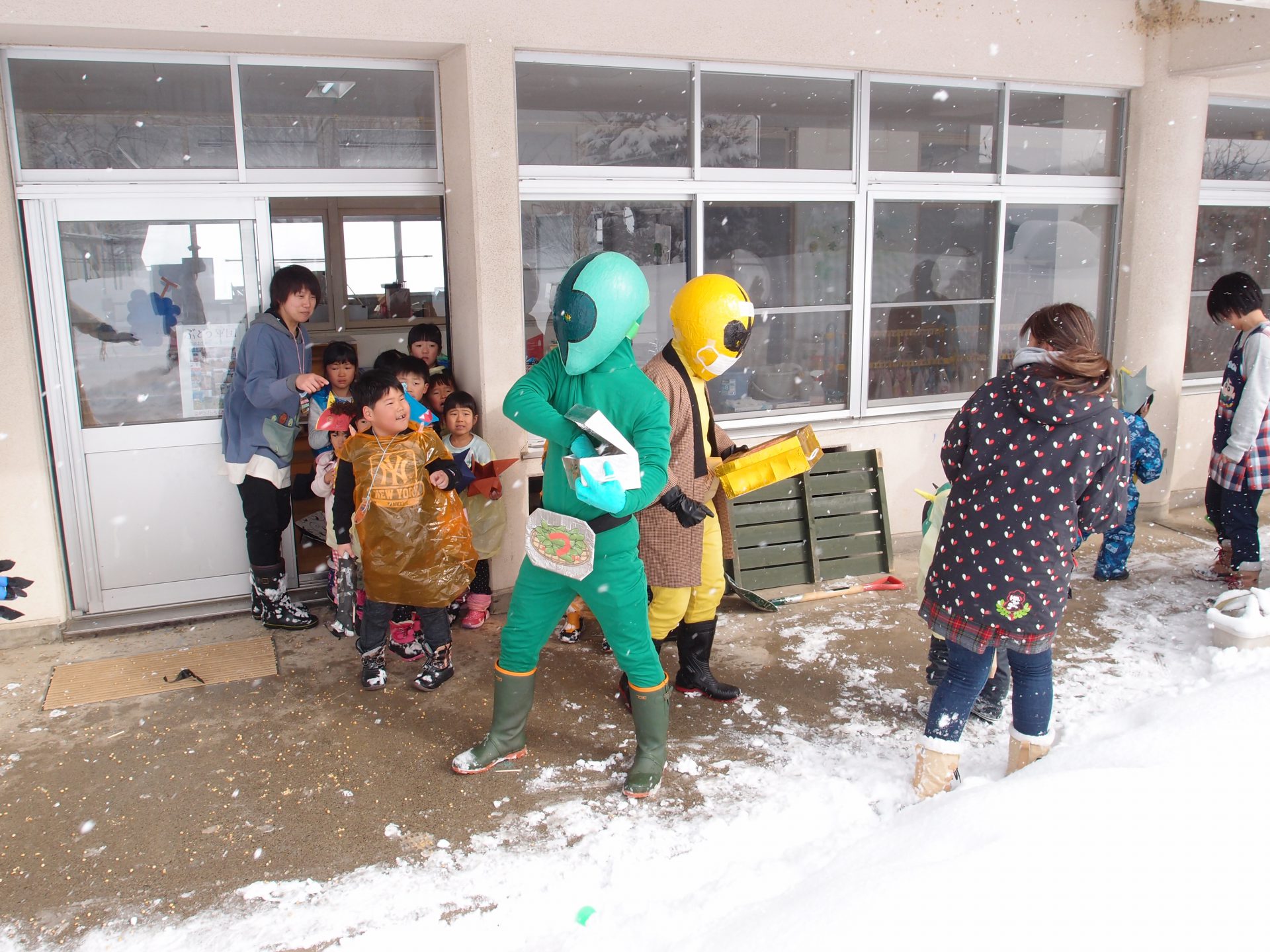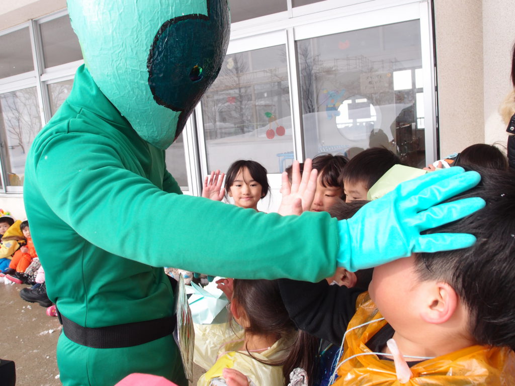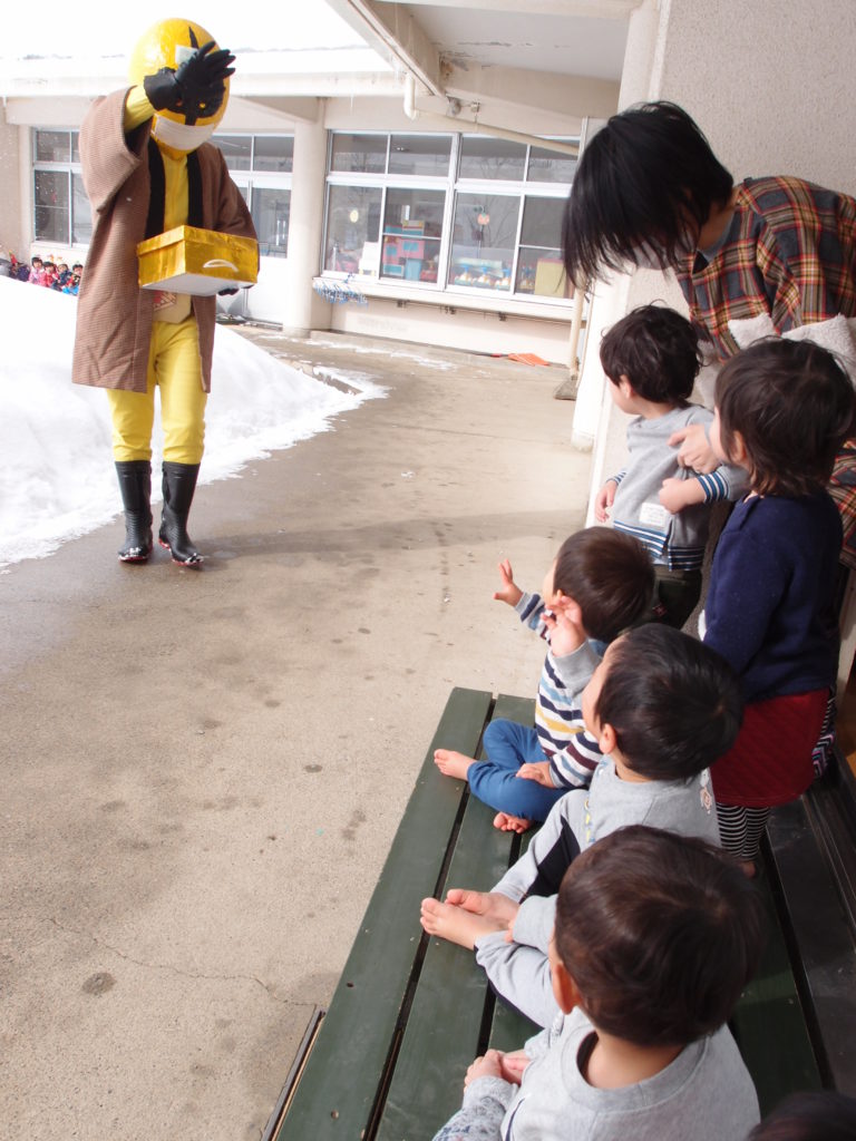 「今日はマメマイター転ばないで大丈夫かな⁇」去年のマメマイターは雪山ですっ転んでしまっていたので子どもたちの印象は、、、大丈夫?の心配。