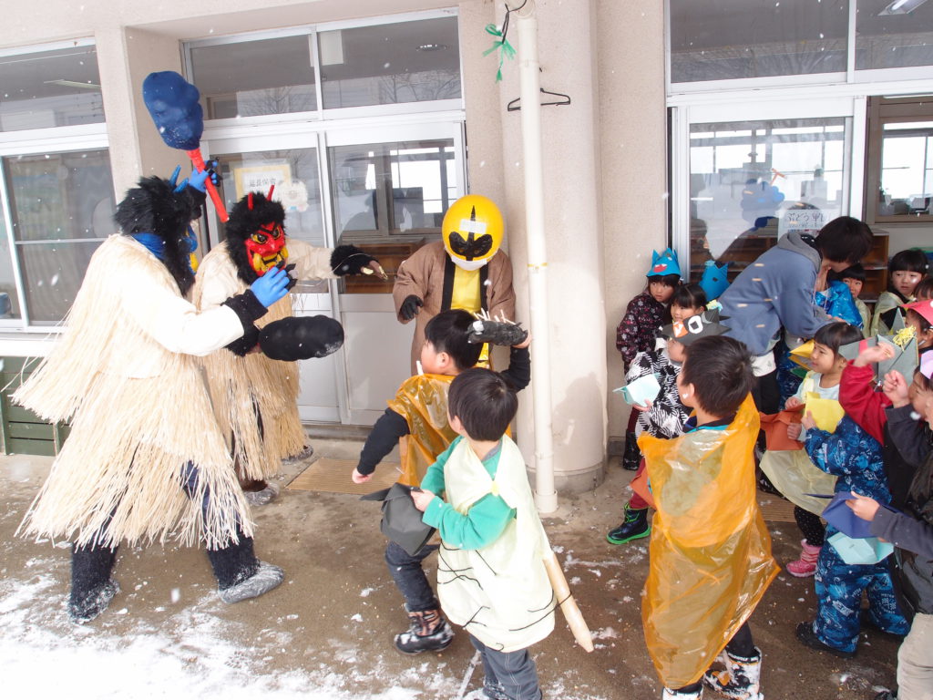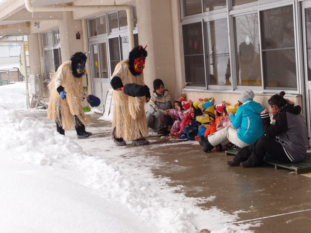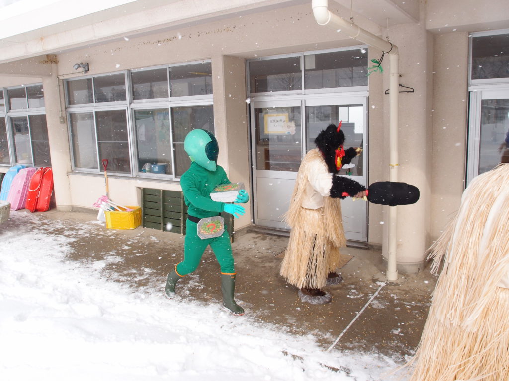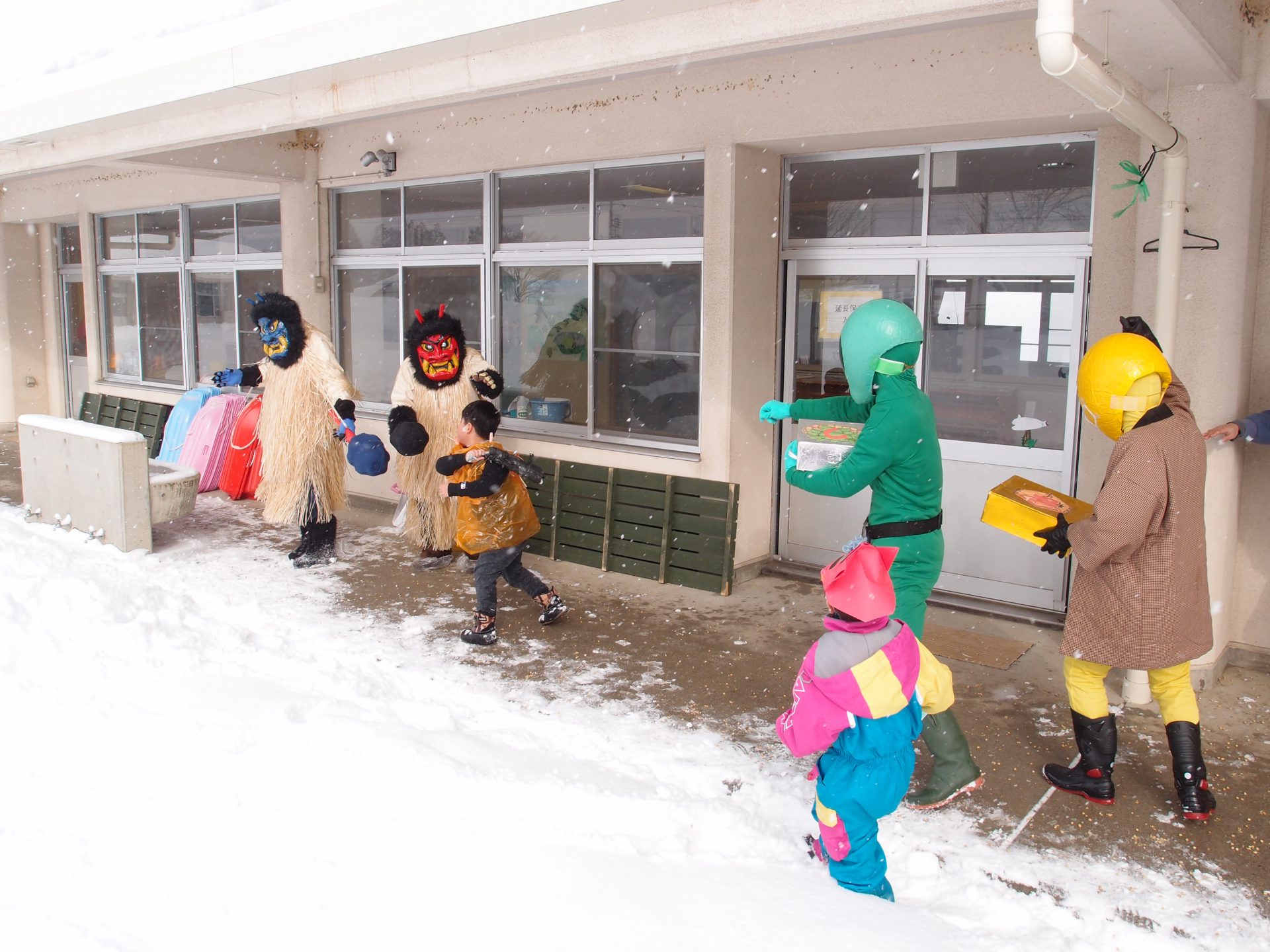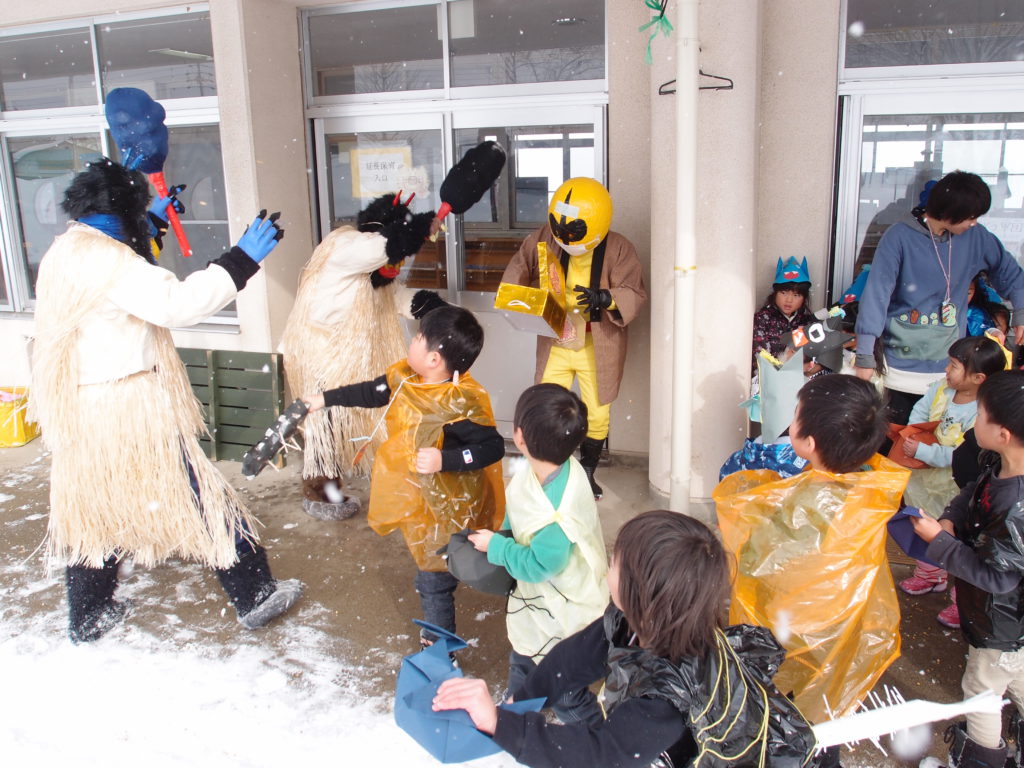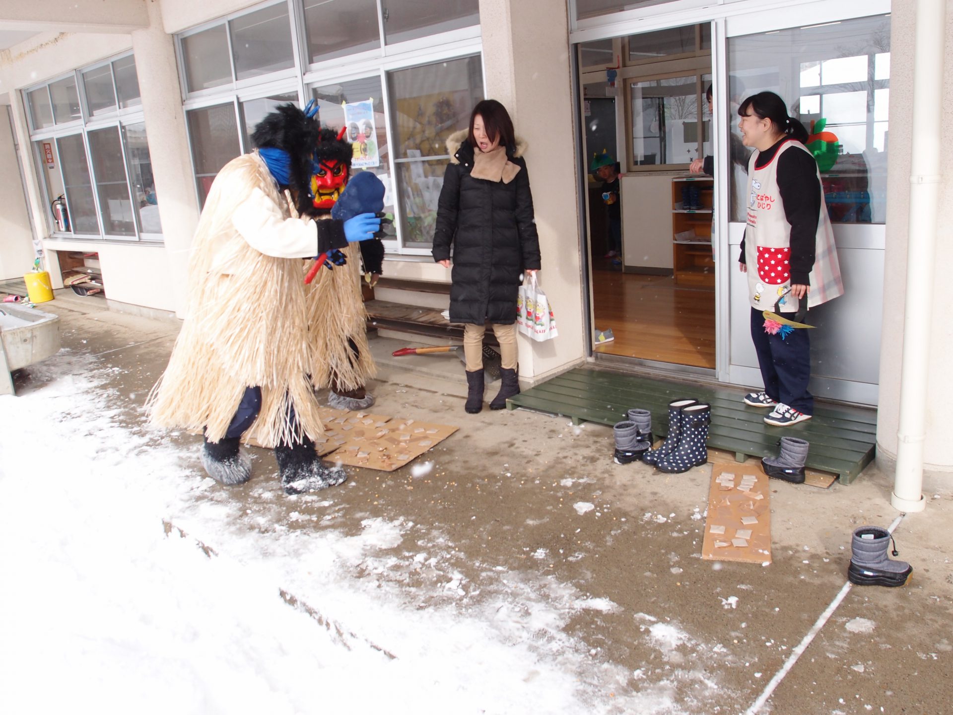 怖がりながらもしっかりなまはげたちに豆を投げています。