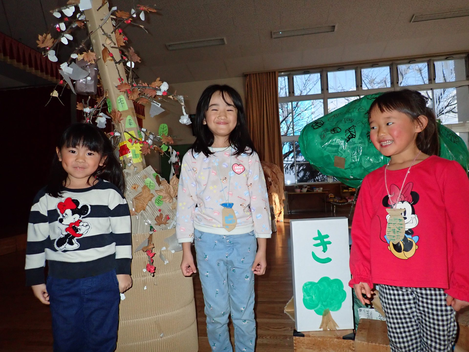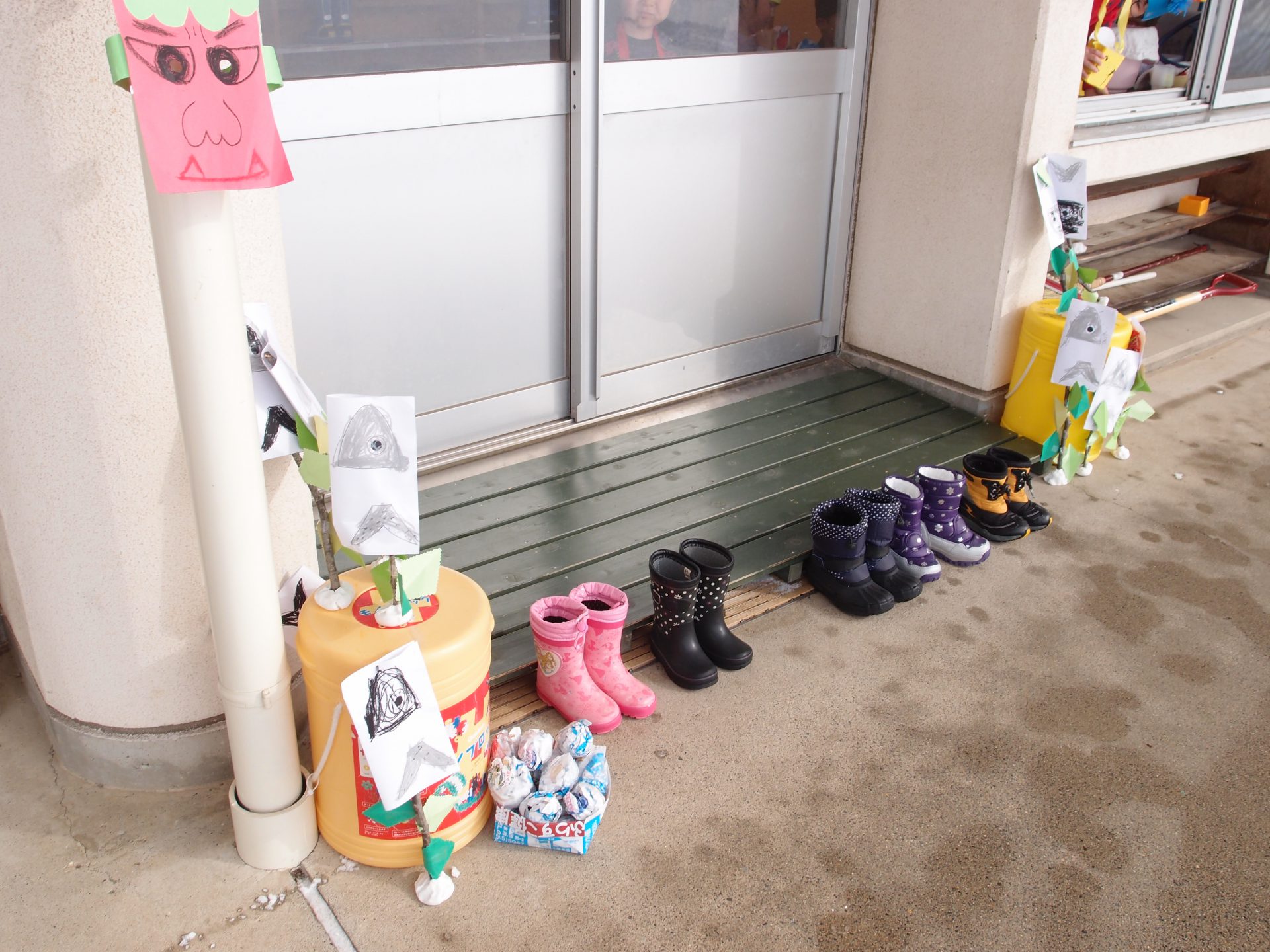 年中さんは保育園に鬼が入らないようにと、いろんな入り口のところに柊と鰯の魔除けを飾っていました。