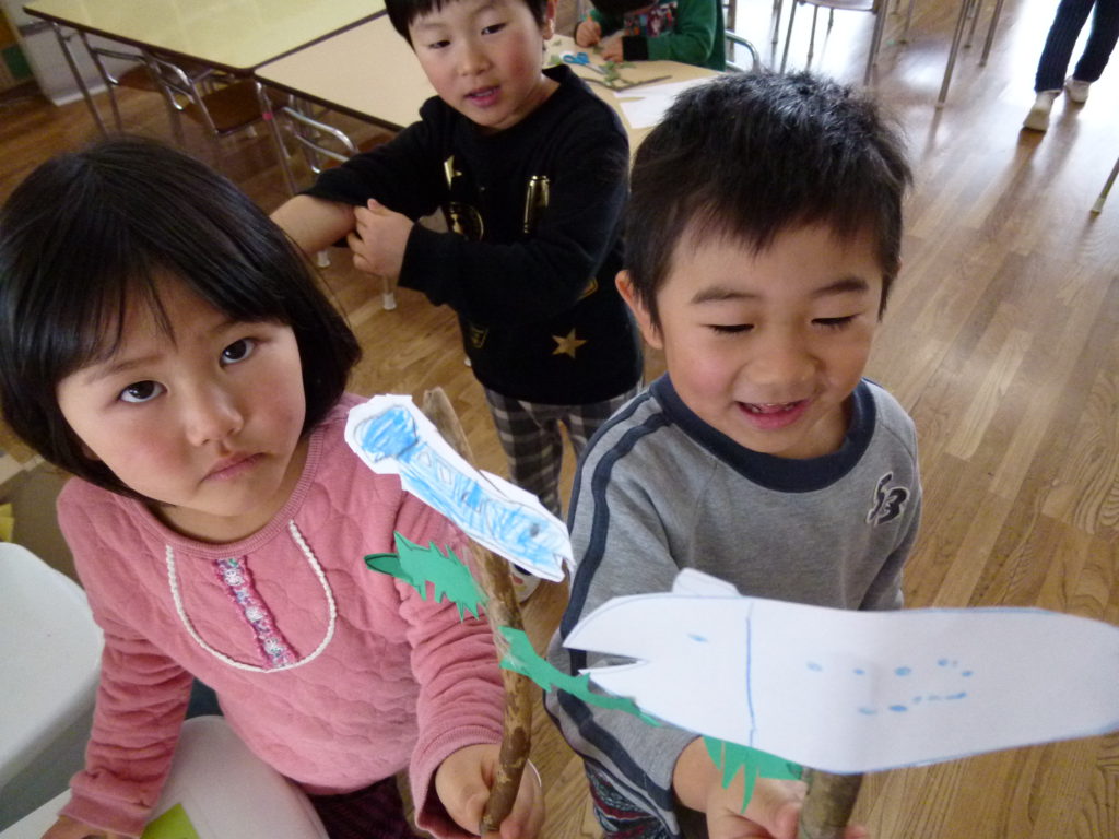 自分たちで柊の葉っぱと鰯の顔を描いて木の棒につけていました。