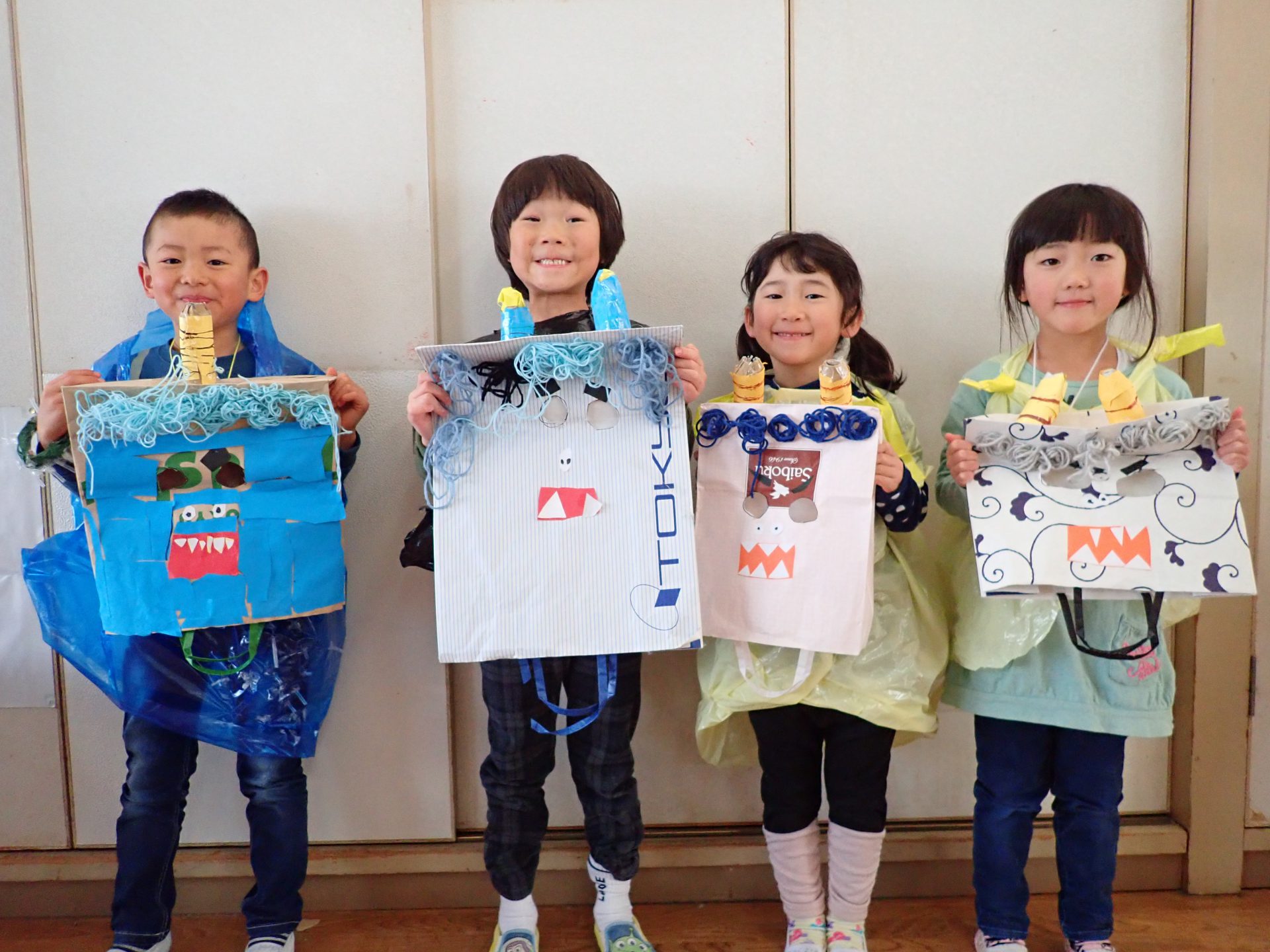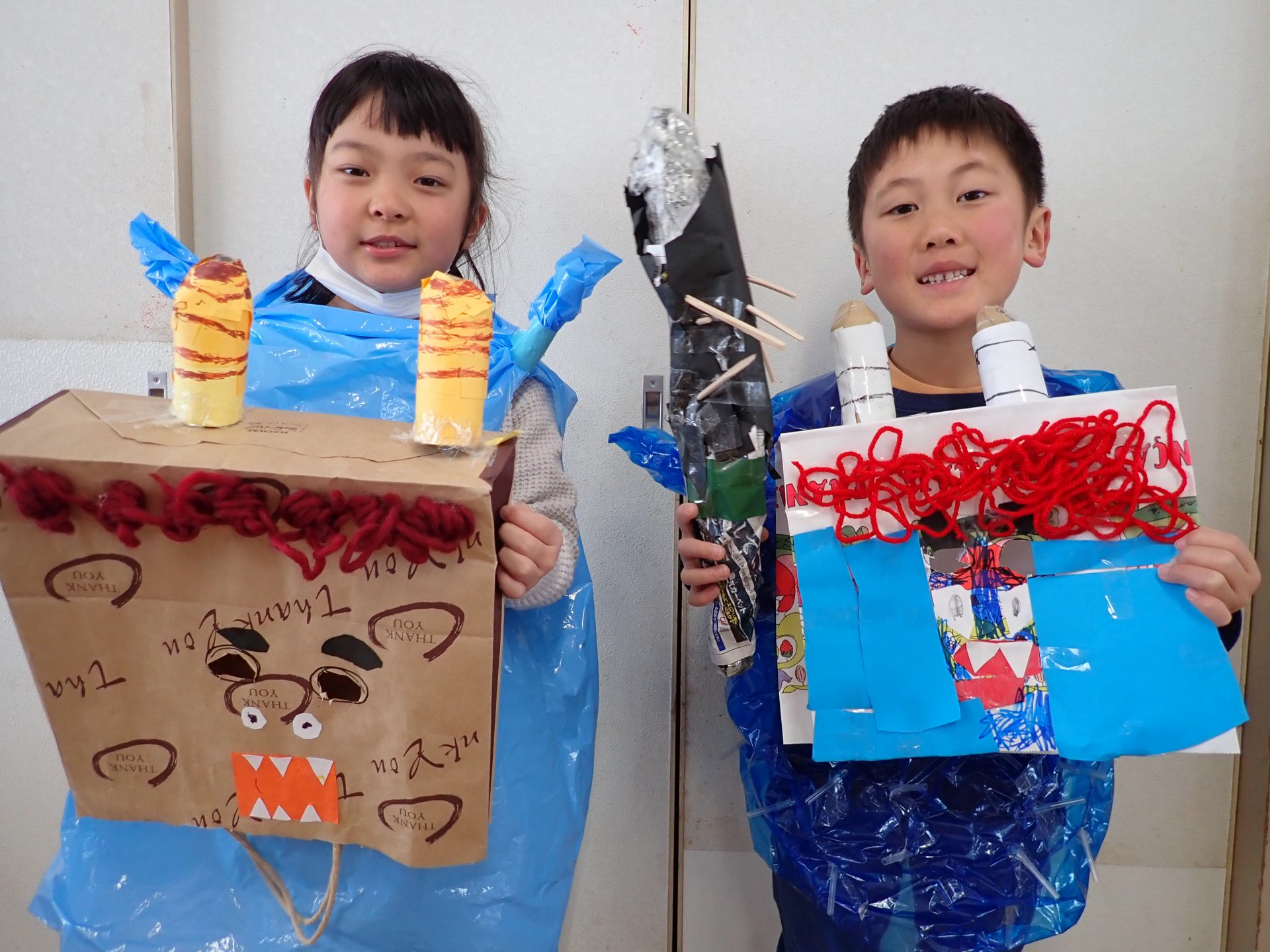 年長さんの作った鬼の洋服や金棒をよく見ると、トゲトゲチクチクの付いた衣装でした。