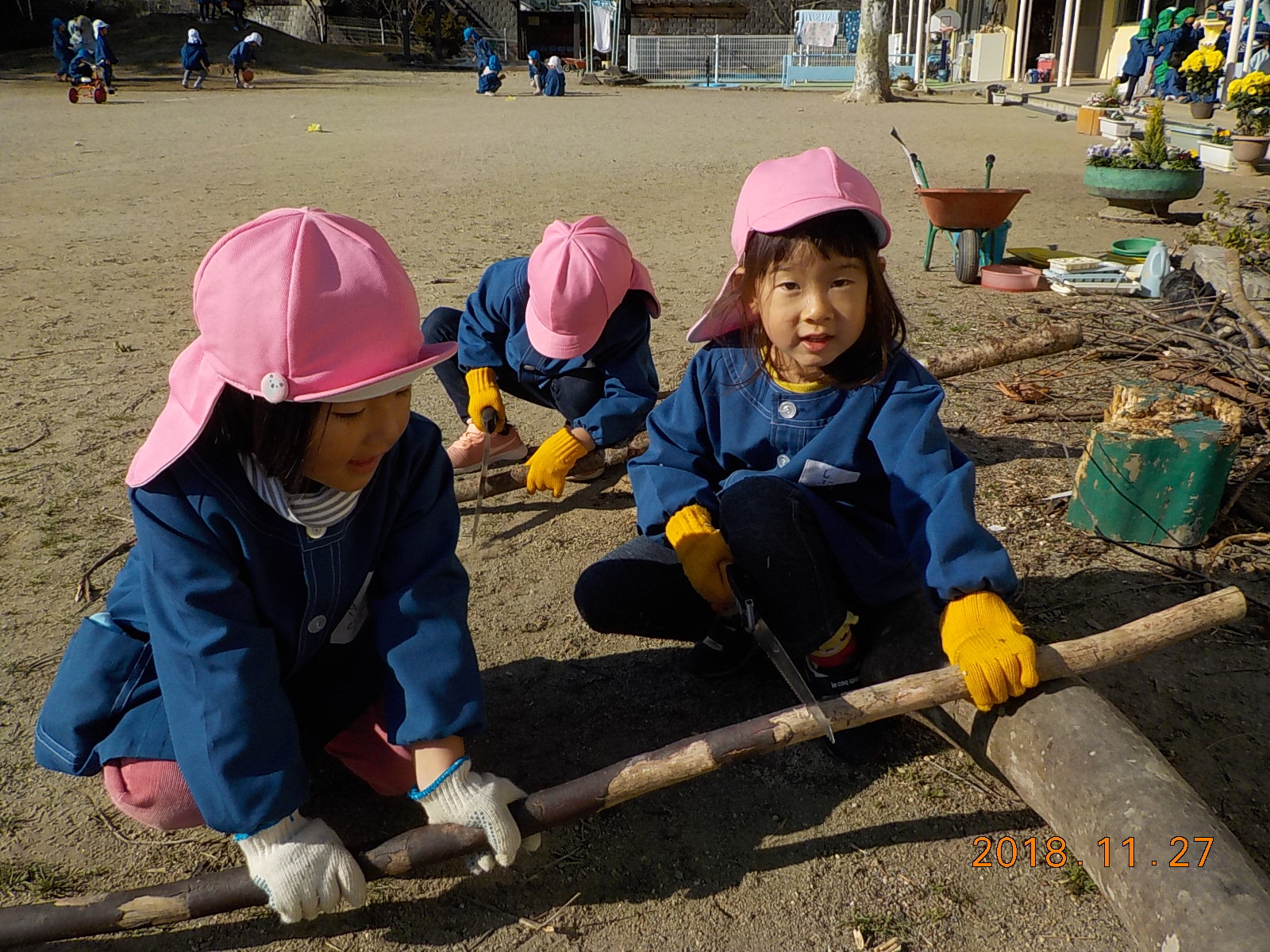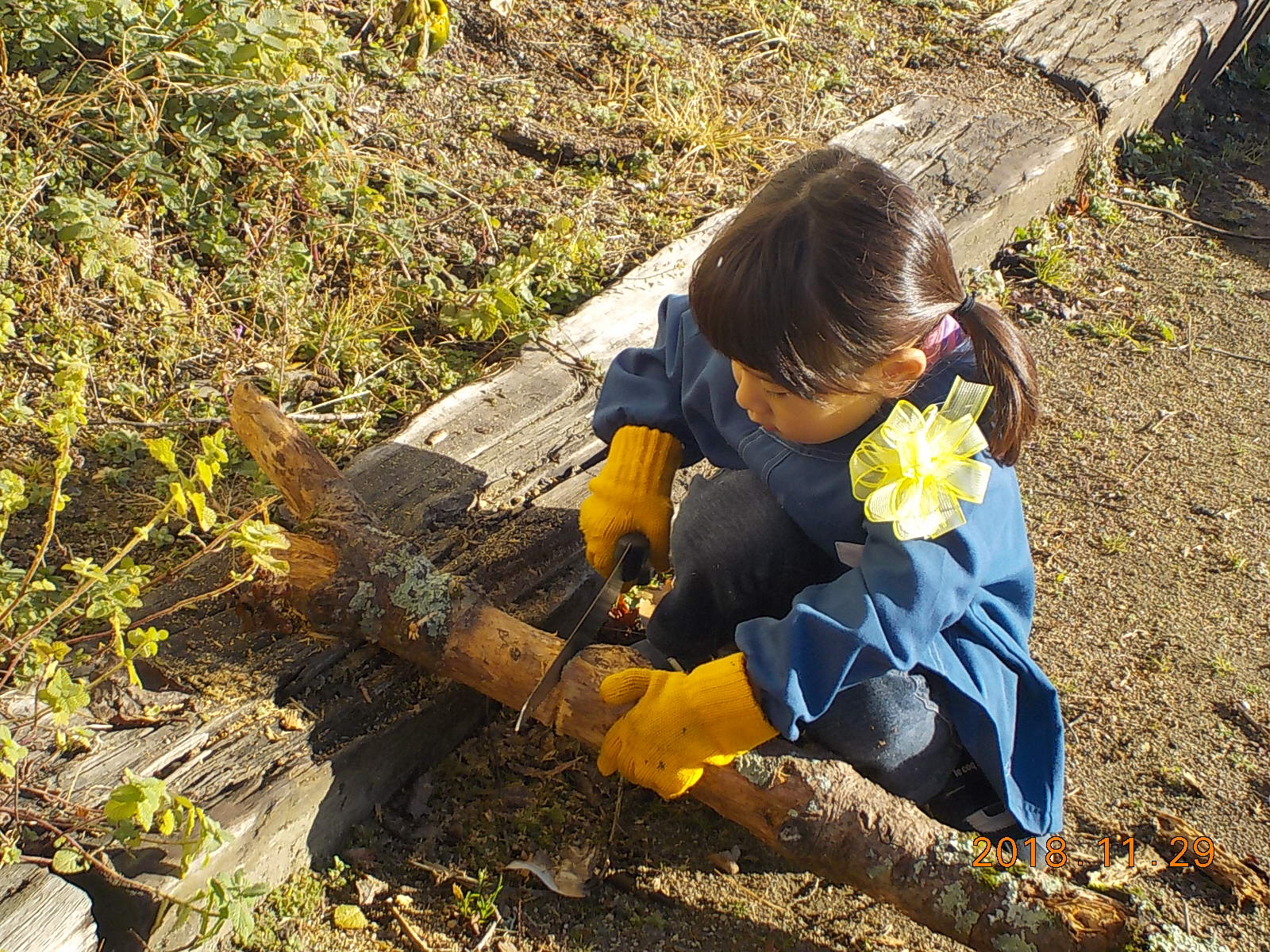 ・かまどに入らない木は、ノコギリで切ればいいと一生懸命切っている。木がずれるのを友達が気付いて「おさえとってやるな。」と声をかけ協力している。