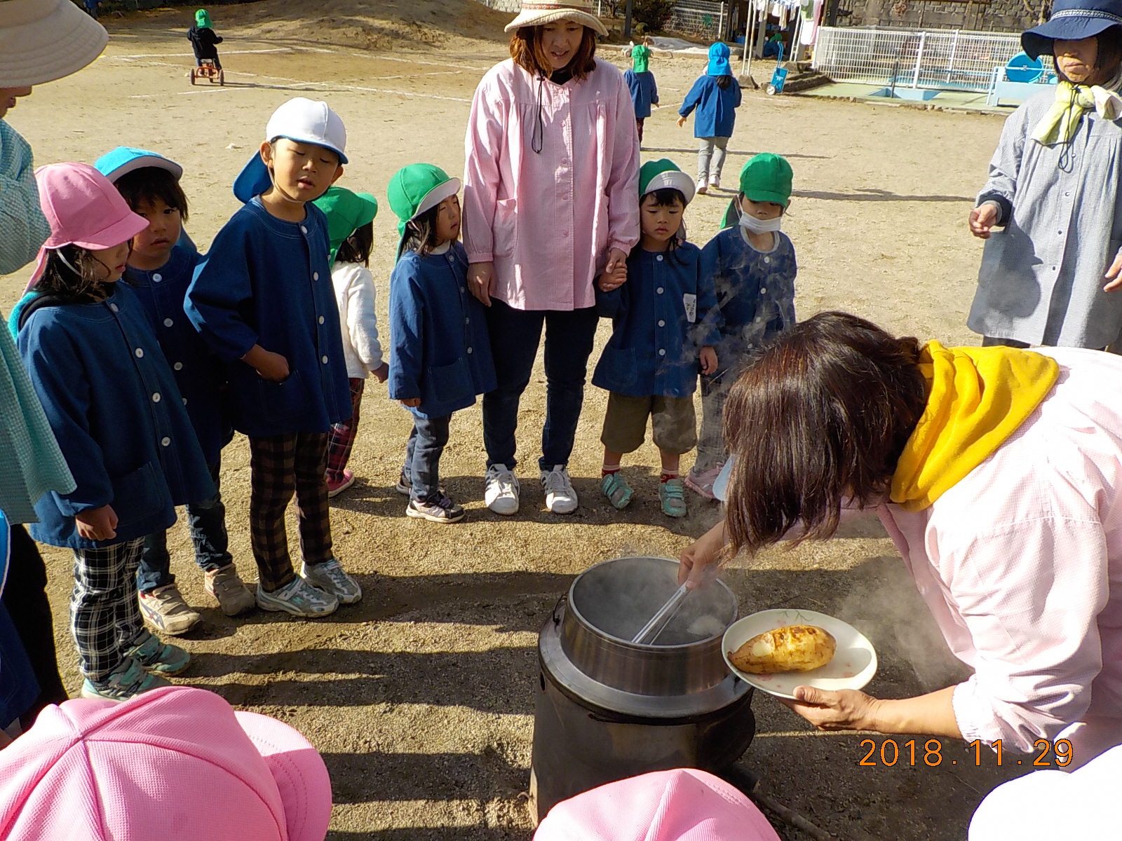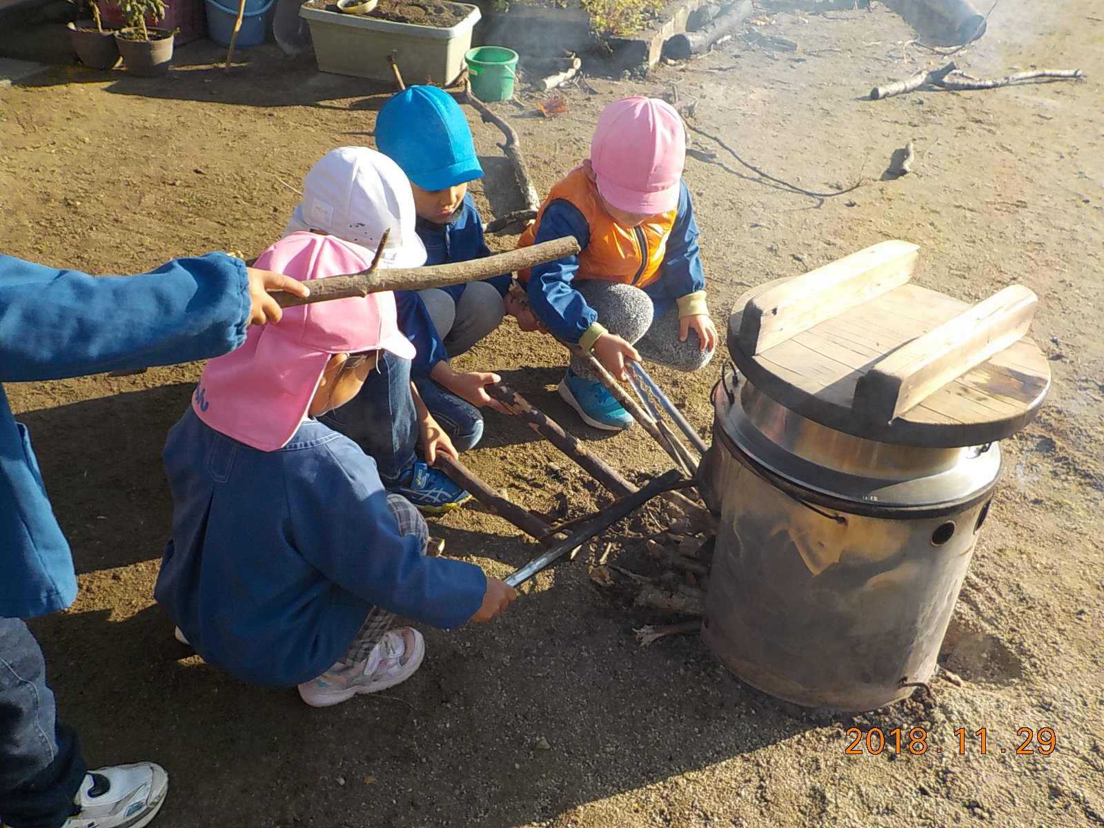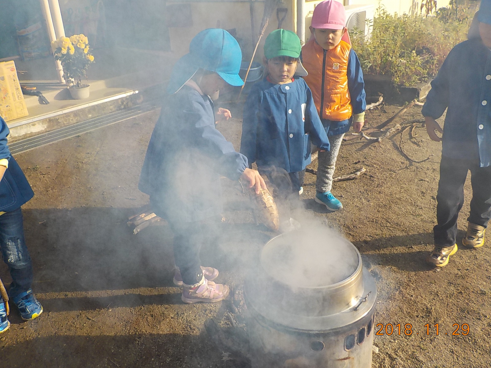 ・おかまの湯がぐらぐらに沸騰してきて、その中に芋を入れる時、おかまの淵から滑らすようにゆっり入れないとお湯が飛び散り火傷をすることを知る。年長児に任せると、指がおかまやお湯に触らないように気を付けて芋を入れている。