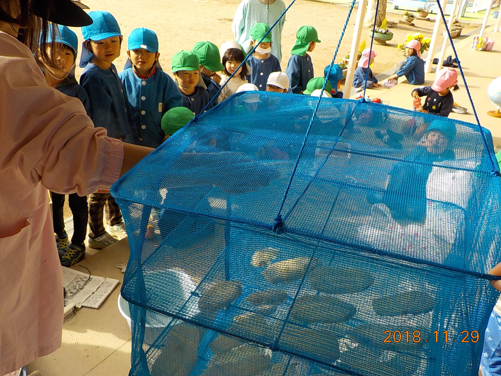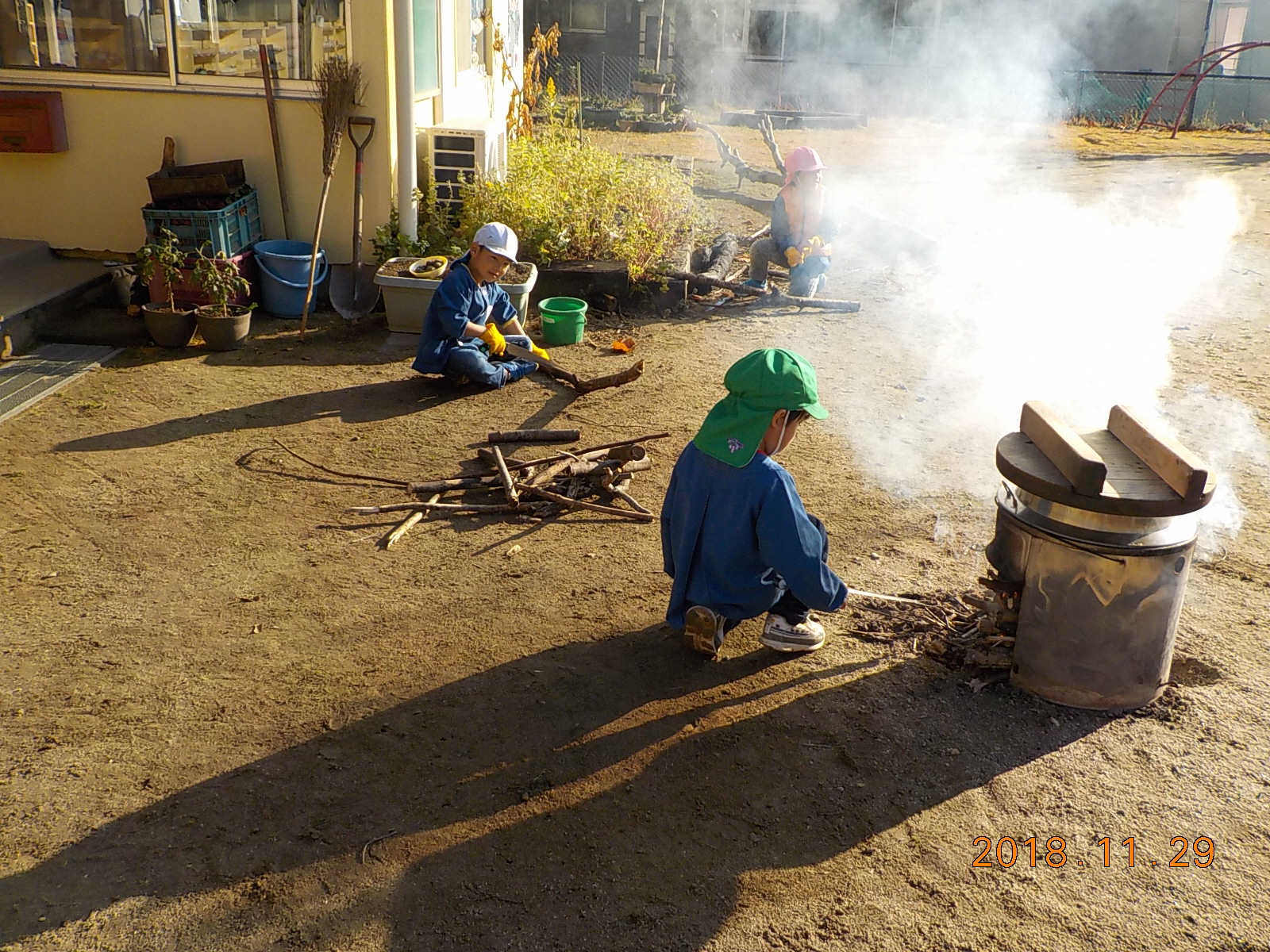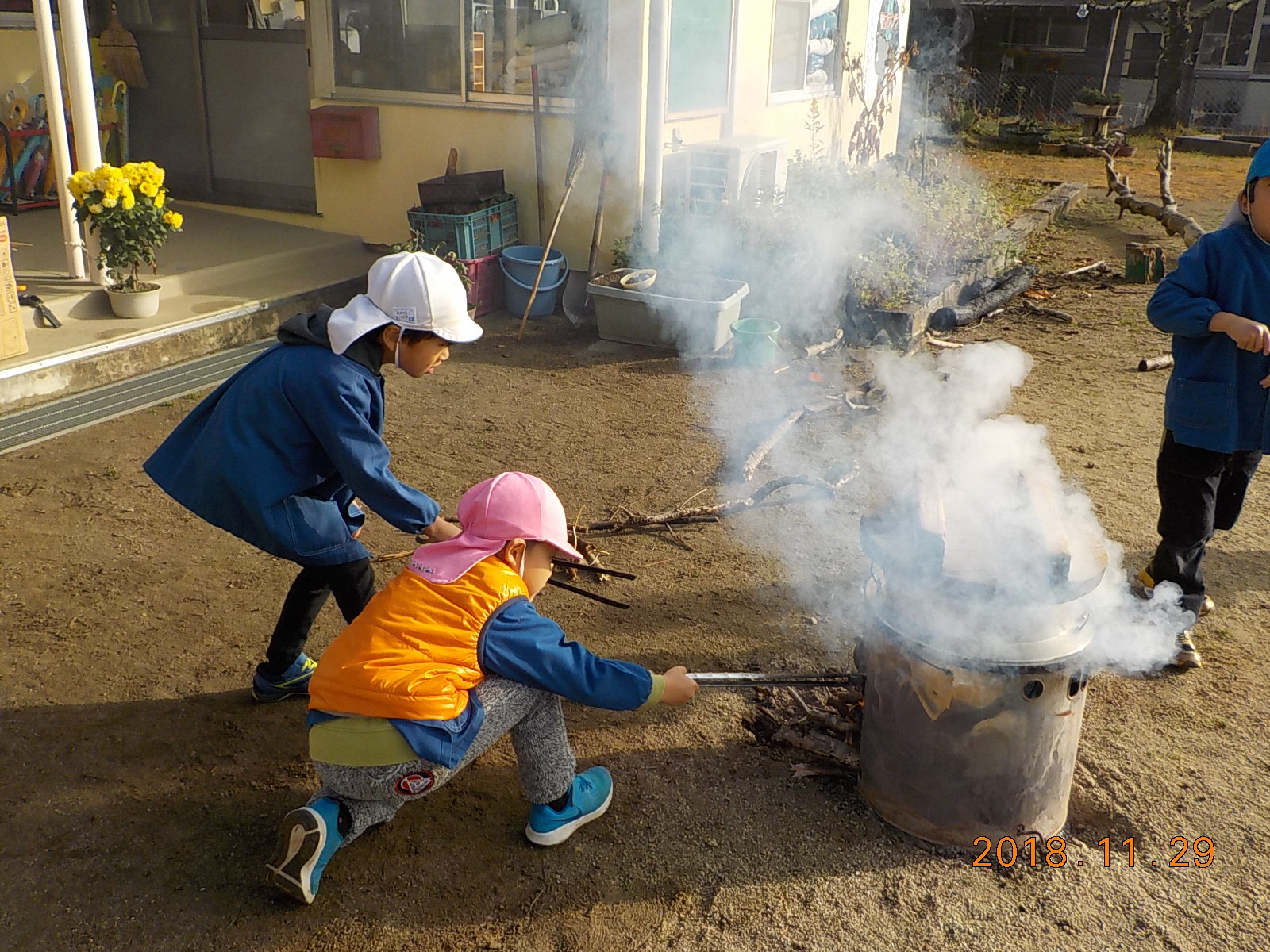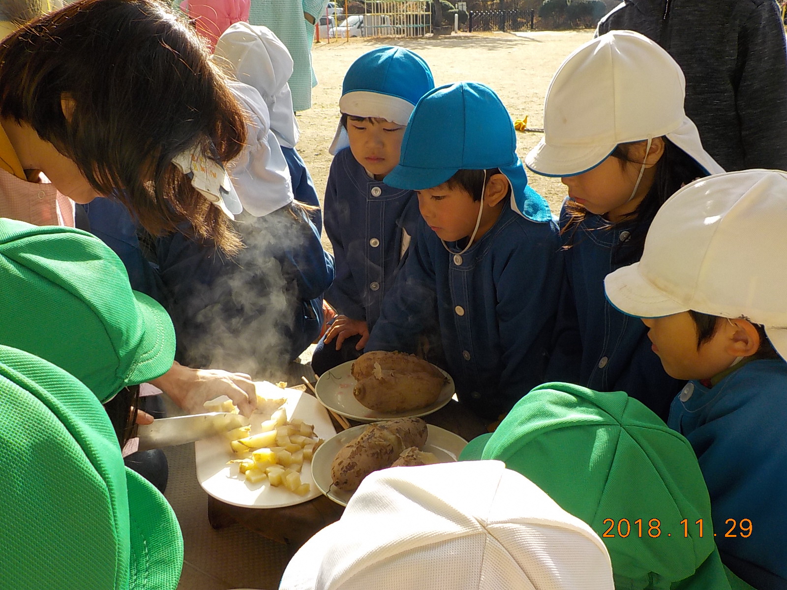 ・おかまの湯がぐらぐらに沸騰してきて、その中に芋を入れる時、おかまの淵から滑らすようにゆっり入れないとお湯が飛び散り火傷をすることを知る。年長児に任せると、指がおかまやお湯に触らないように気を付けて芋を入れている。
