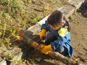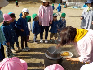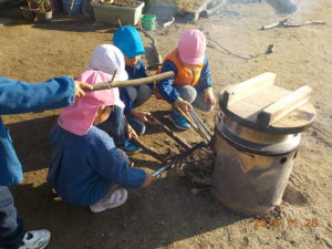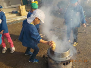 ・11月、12月と焼き芋をしたり、おこわをふかしたり、芋干を作ったりして何度も火を焚いた。あえて、ラインで囲まず自分で判断してどこまで近づいたら危ないのか考え体験できるようにした。大人に見守られながら火に触れるという経験は、なかなか家庭ではできにくいと地域交流会の中での保護者の方の声があった。火を扱うことは人間の原点でもあり、楽しく、美味しく、心地よいことだと思う。山がすぐそばにあり焚き木が豊富な環境を活かし、これからも子ども達と一緒に自然体験を深めていきたい。