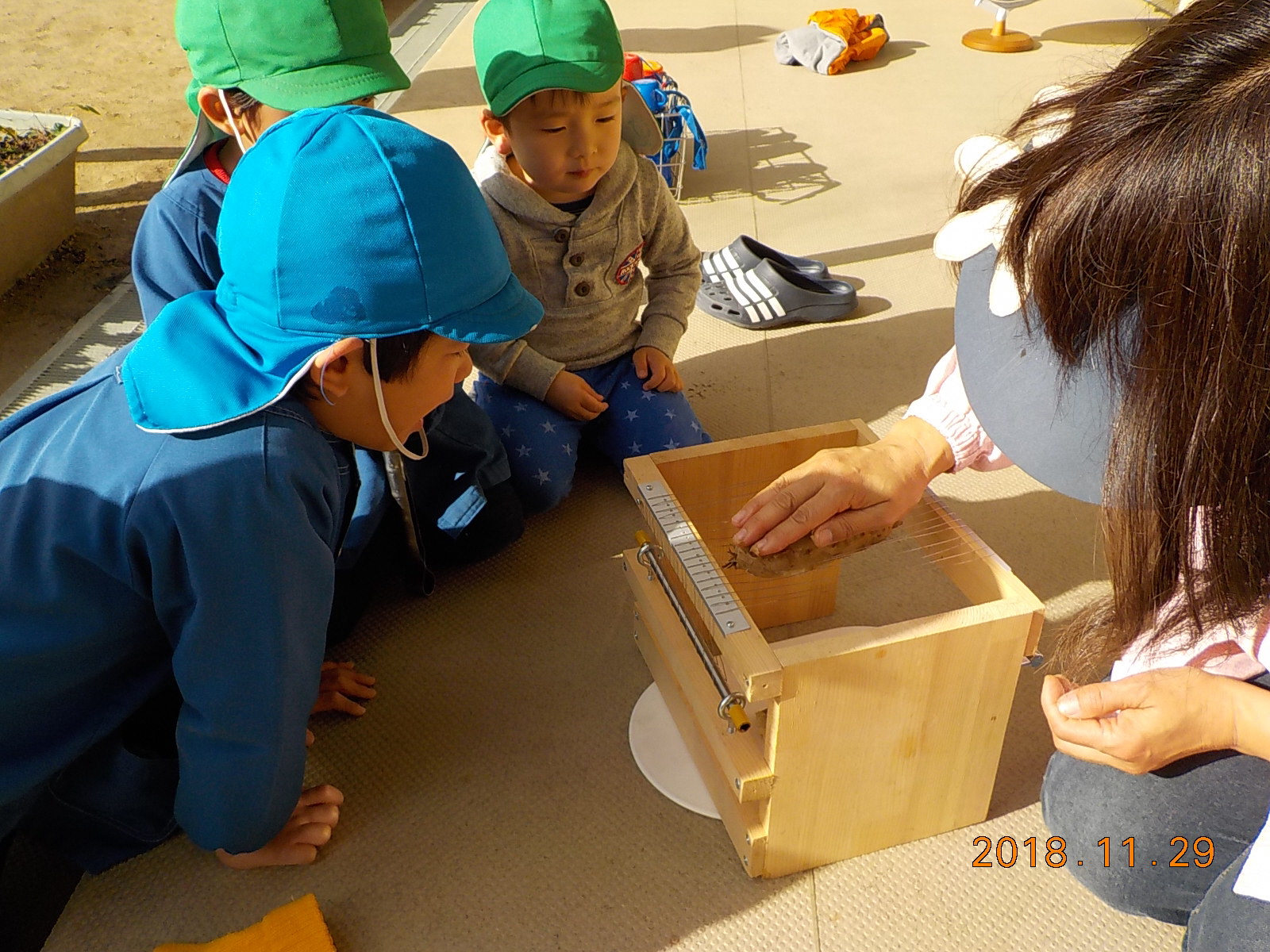 「あつっ!」「ふ~っ ふ~っ」「あまーい。」芋干用の芋もこんなに甘いものだと保育士も初めて知りました。