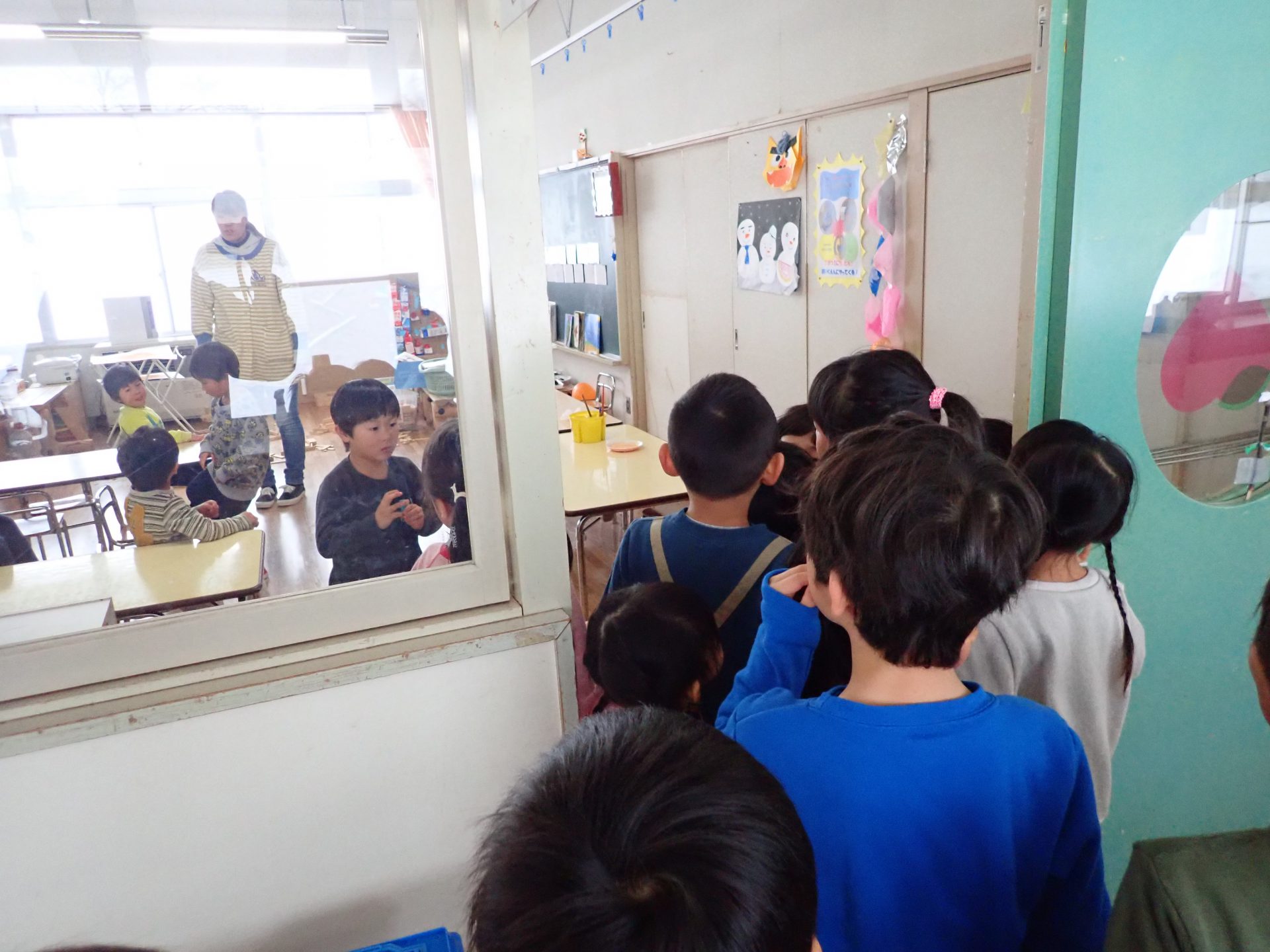 年長さんも年少さんの反応から何かを感じたのか、すぐに一人ひとりが近くに寄り、丁寧に説明する姿がありました。
