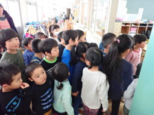 この日は朝から張り切って登園してきた子ども達。早速、年少さん、年中さんの部屋に行き、『ぶどう組博物館と劇の発表を観に来てください!』と誘いに行ったのですが…