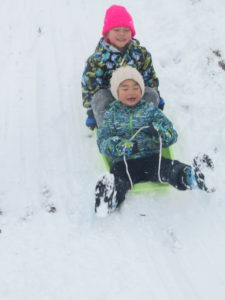 夏にウォータースライダーを楽しんだ斜面。冬になると、ちょうどいいソリ滑りのコースに変身するのです!!