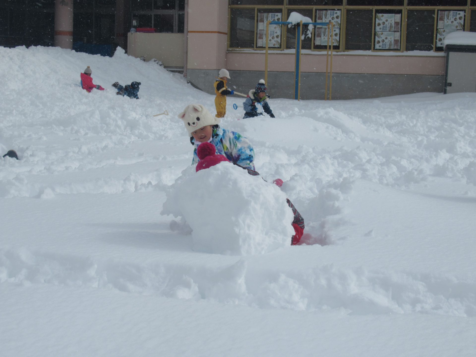 外に出ると、まずは雪の上を歩いたり丸めたりする子どもたち。よく固まる日には、雪像作りやバケツの型抜きケーキもしました。