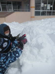 上手く雪玉が転がらず、上から押したり横から押したり試行錯誤していたお友達。