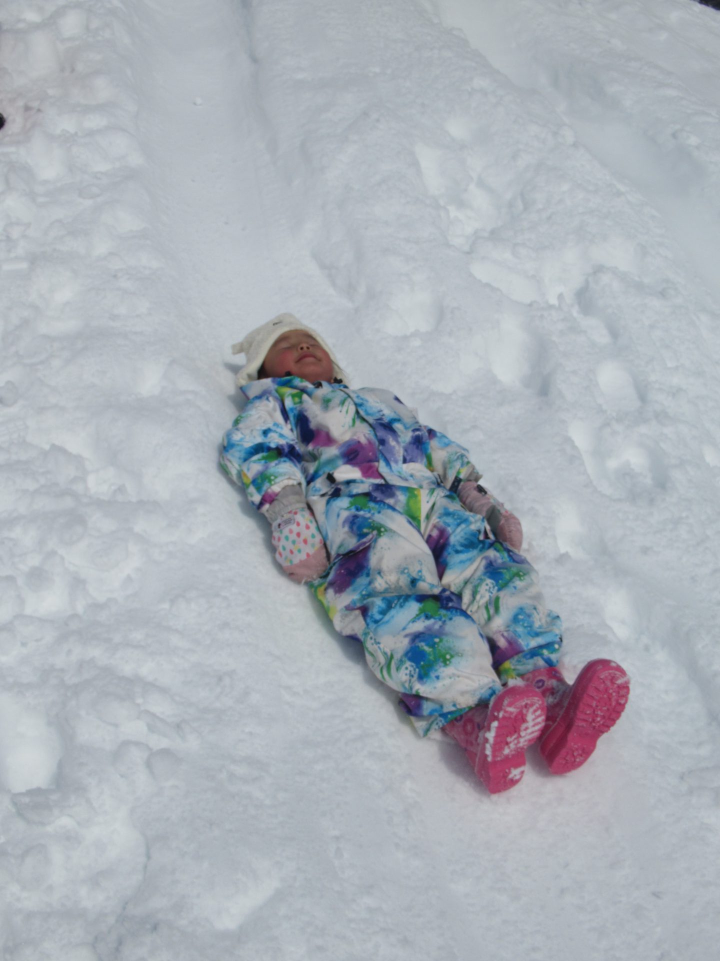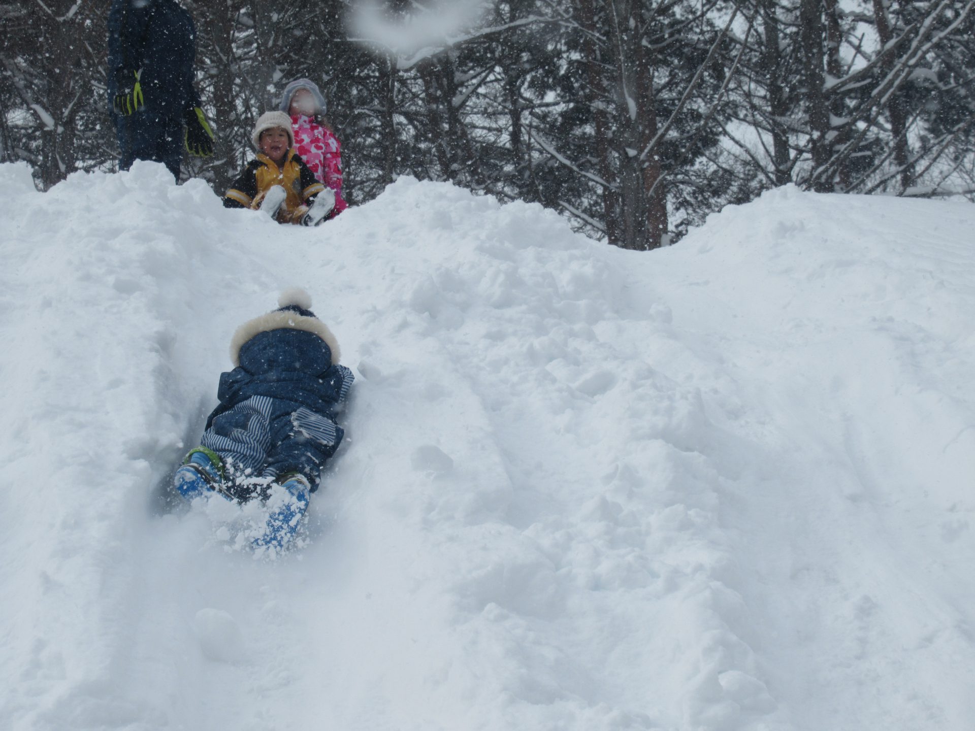 出来た雪だるまに顔を作ったり、滑り台のようにして遊んだり。