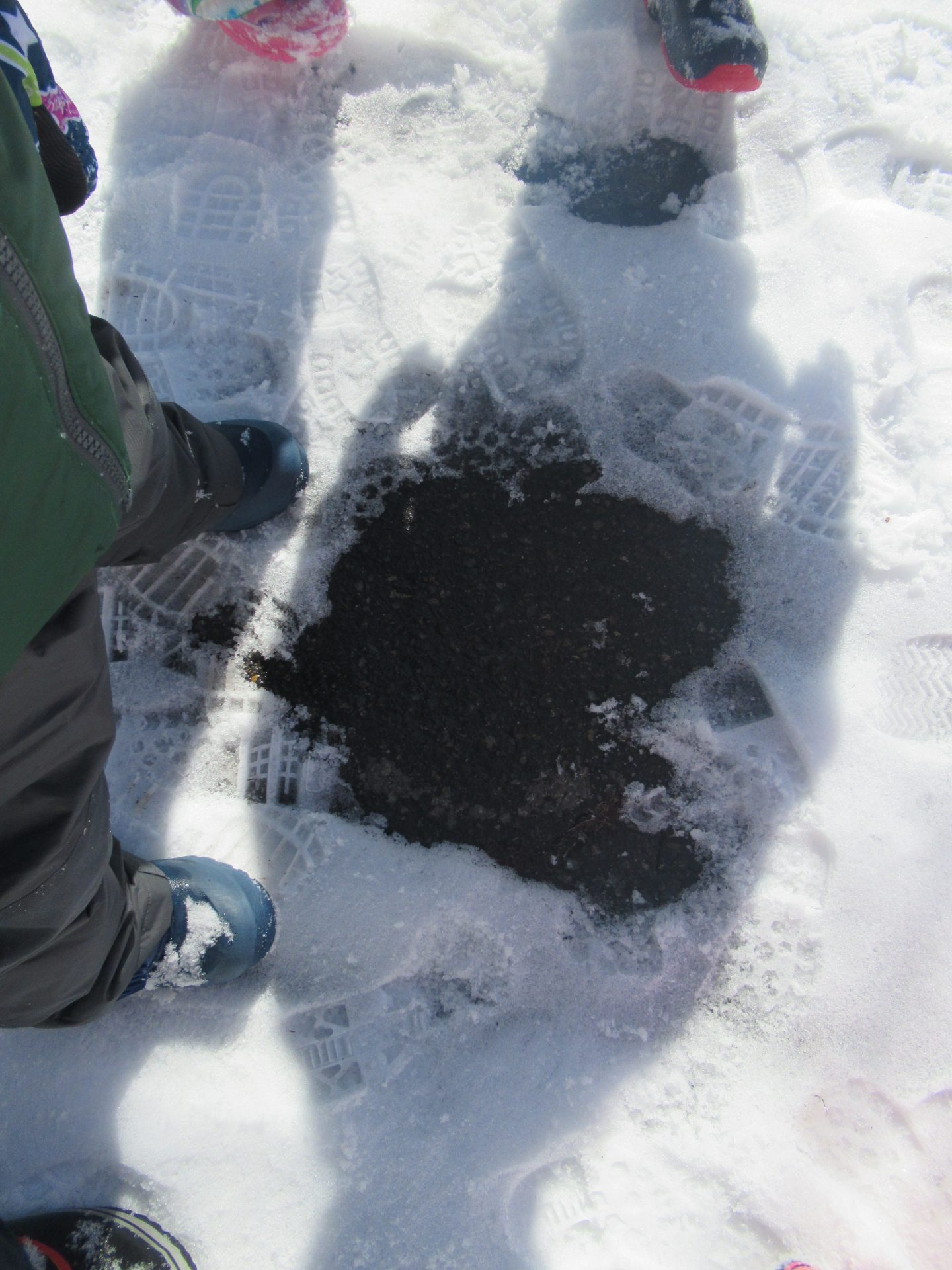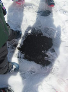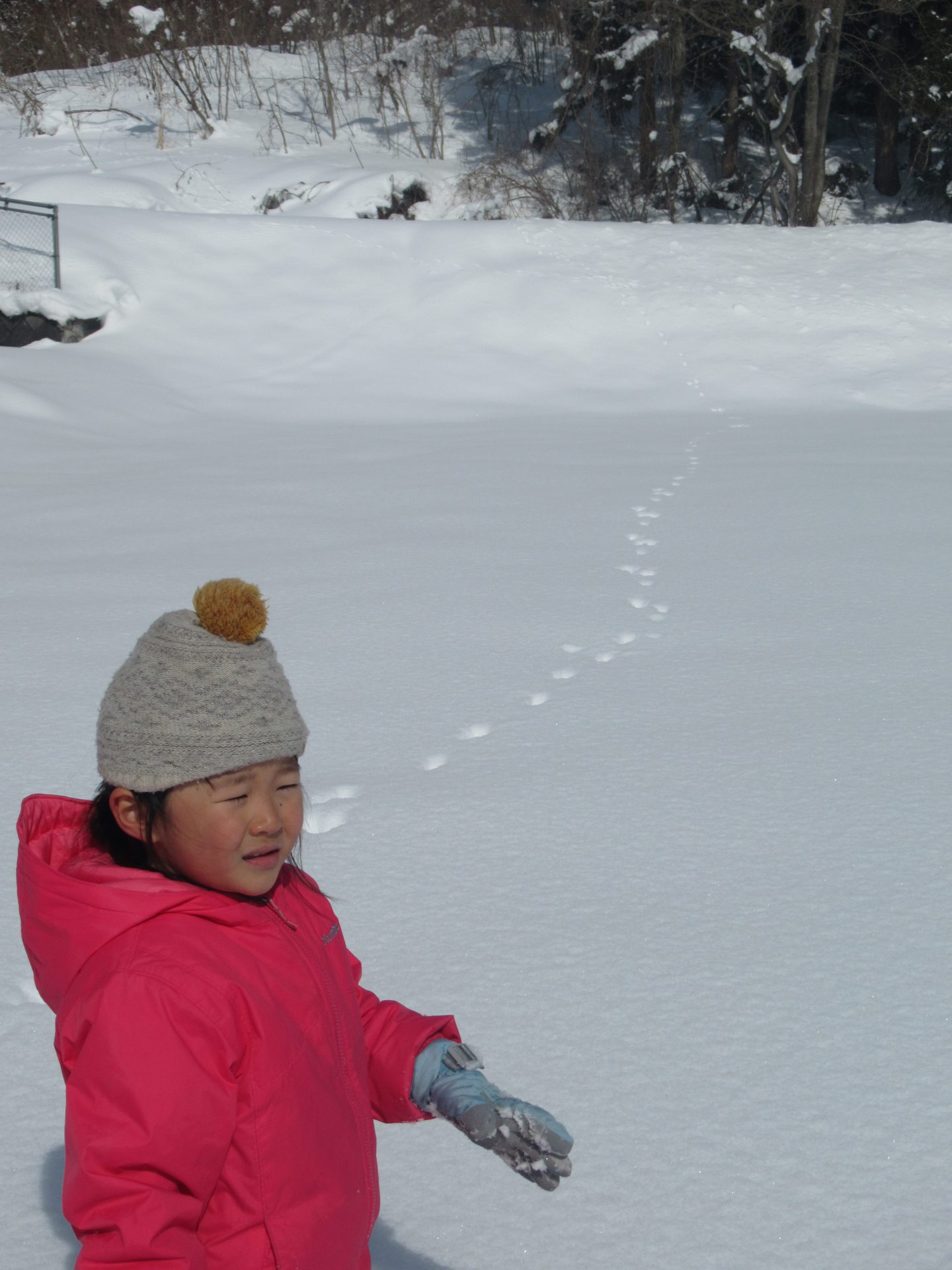 とびきり大きな足跡を見つけ、「雪男だ!!」「雪男も、ここが好きなんだね」と思わぬ出会いもありました。