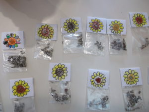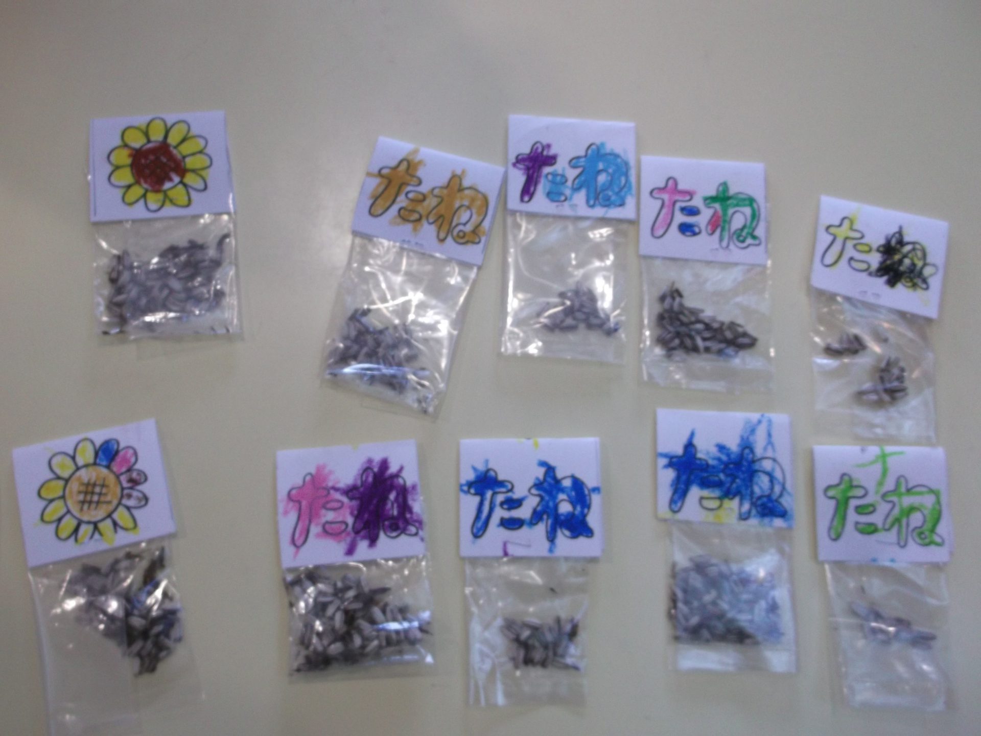 春にひまわりの種をまきました。地域のおじいちゃん、おばあちゃんと一緒に「早く大きくならないかな」と言いながら育ててきました。一人ずつ袋に入れてひまわりの絵を付けてみました。「お店屋さん来てね」のポスターも作りました。