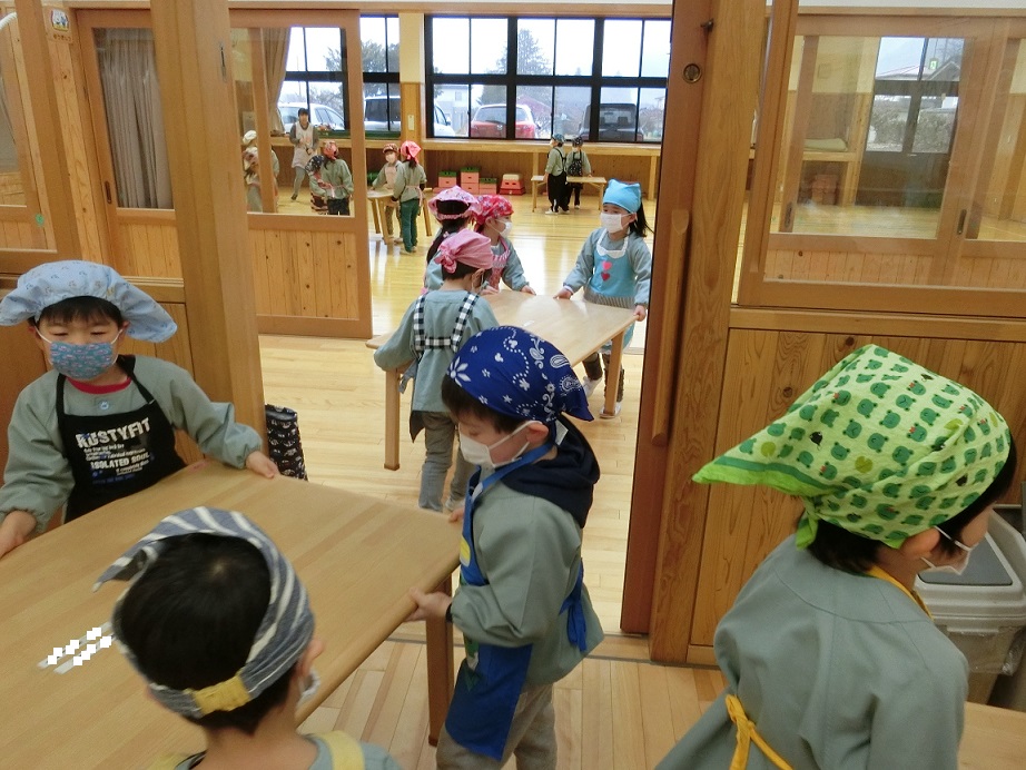 年少児から年長児まで一緒に作るので遊戯室に机を運び込みます。