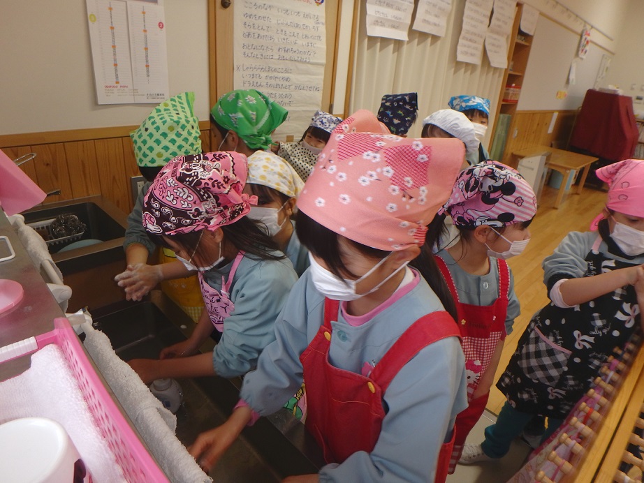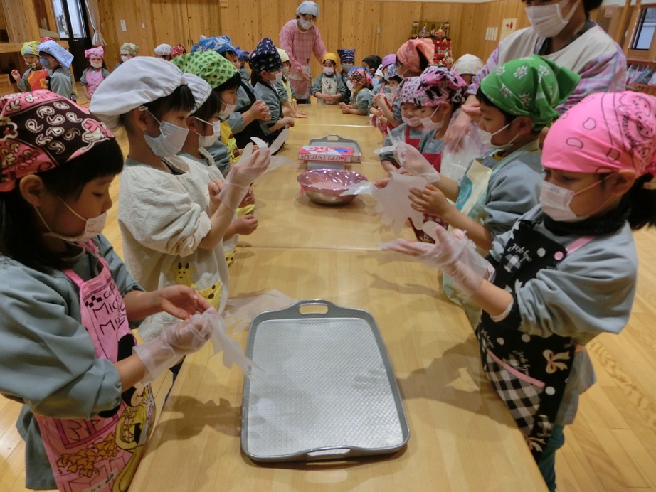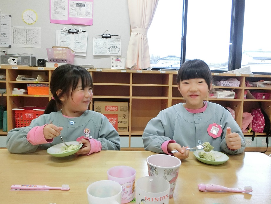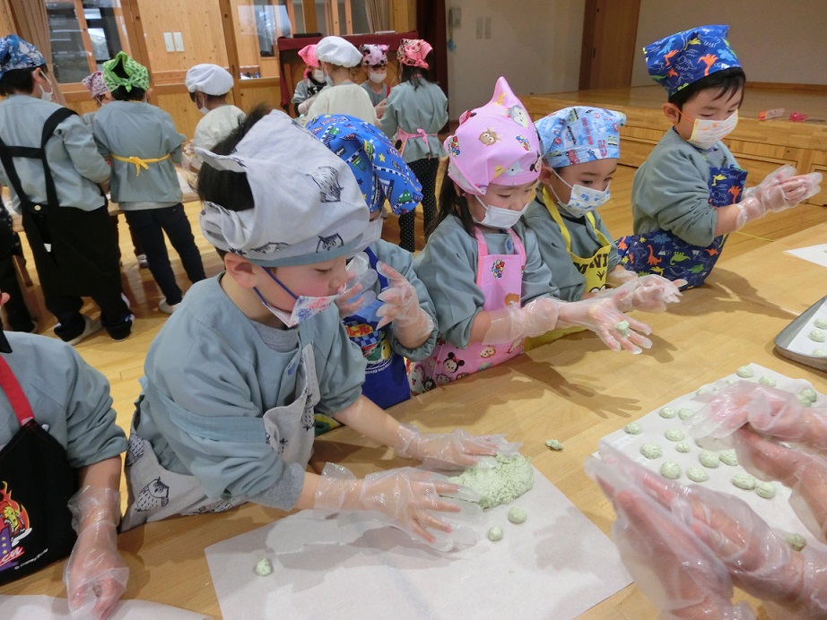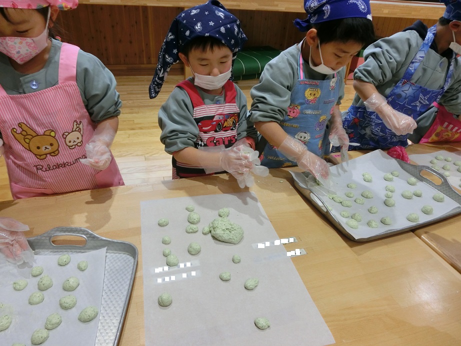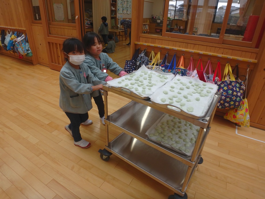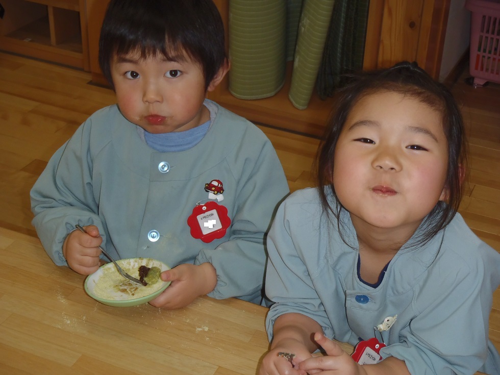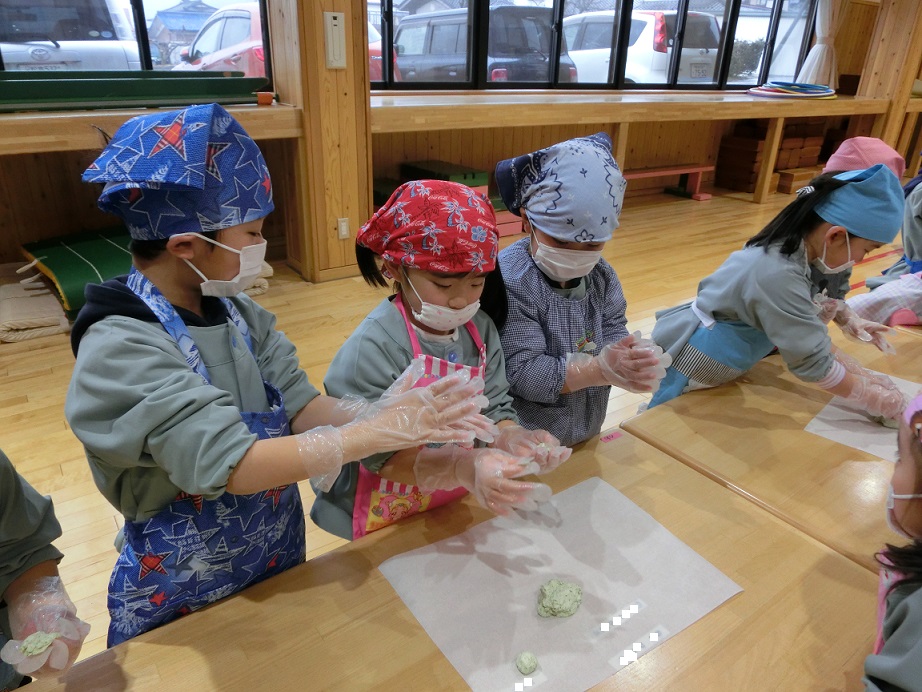 年少児にも団子作りの経験をさせたいと思い最初は1月の下旬を予定していましたがインフルエンザが流行したので延期しました。年度末にはなりましたが経験させることが出来良かったです。
