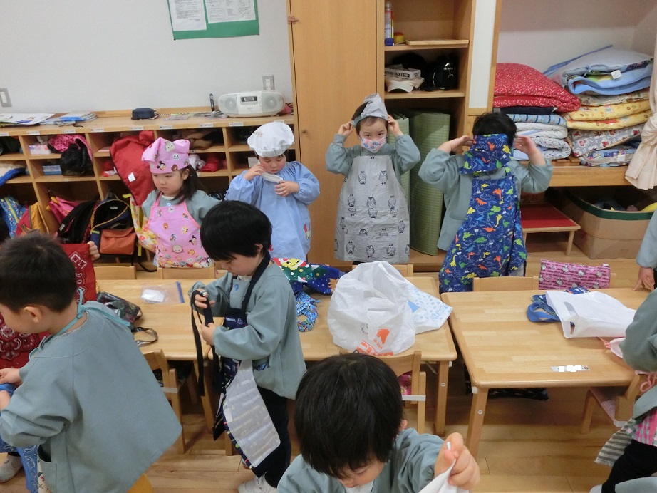 年度末近くになれば年少児も草団子が作れるようになるだろうと春に摘んだヨモギを冷凍保存しておきました。今日はその草団子作りです。年少児も身支度を整えます。