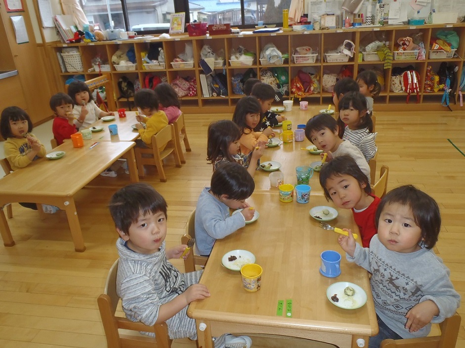 2歳以上児が草団子のおやつです。2歳児も「今日のおやつ、お兄ちゃんやお姉ちゃんが作ったんだって」と言いながら食べていました。