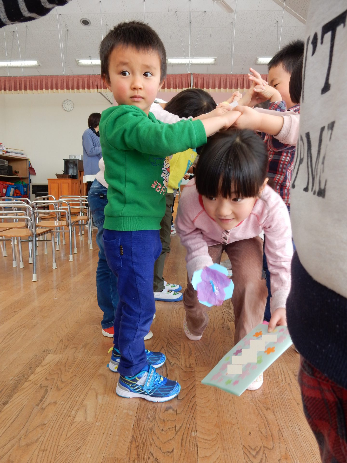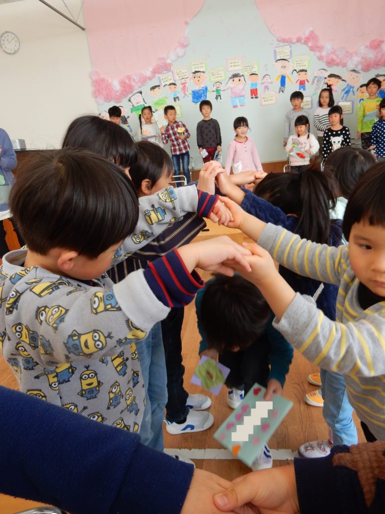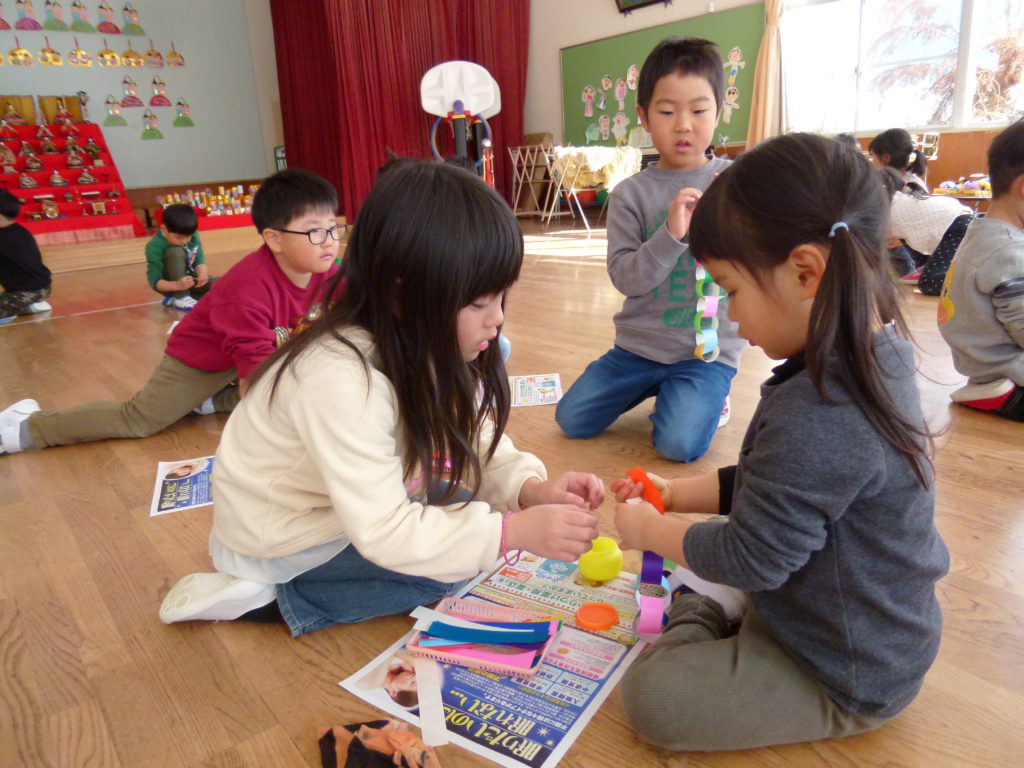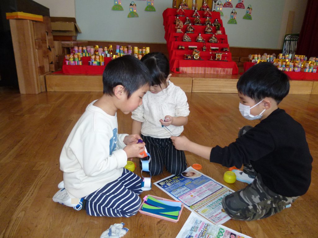 「前に年中さんに教えてもらって一緒に作った輪つなぎを、今度はみんなで年少さんに作りかたを教えてあげて作ろうよ!」「そうだね!どうやって作りかたを教えてくれたかも覚えてるよ!」と。ちょうど昨年の今頃のお別れ会の準備の時に、年少だった子どもたちが年中さんに優しく教えてくれたことを覚えていて今年は自分たちが教える番!と張り切っていました。
