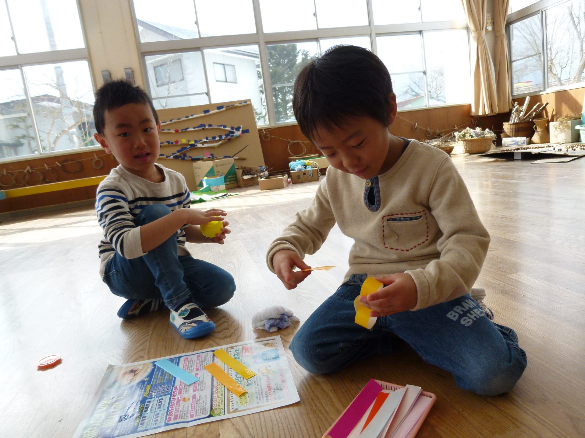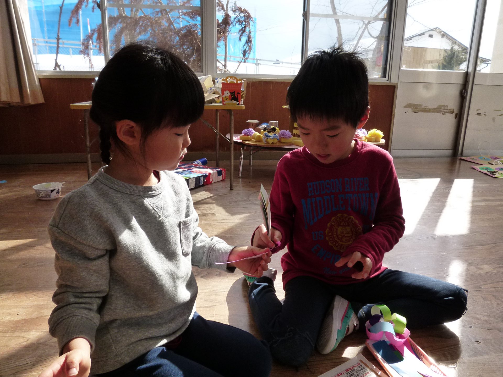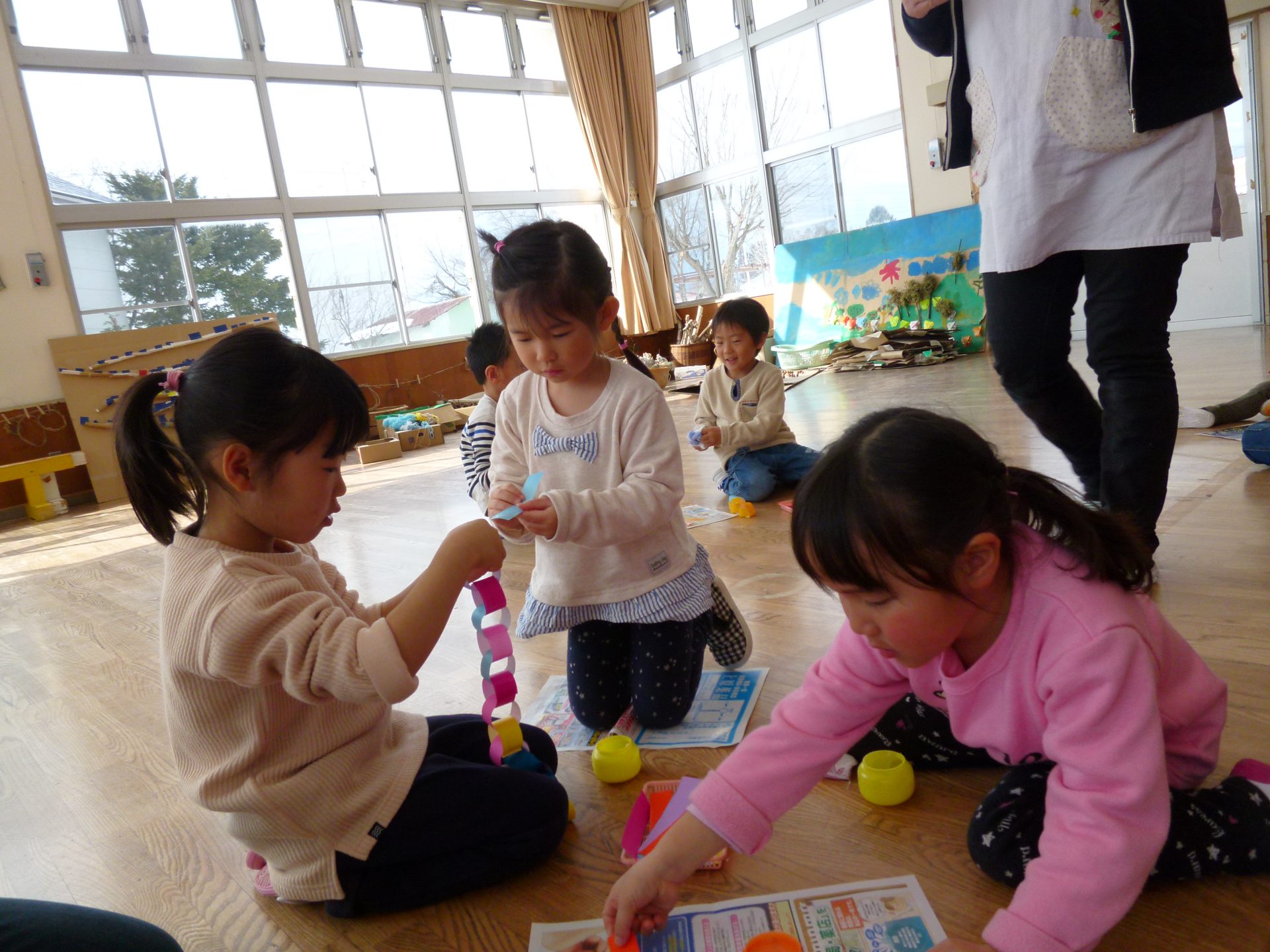 「前に年中さんに教えてもらって一緒に作った輪つなぎを、今度はみんなで年少さんに作りかたを教えてあげて作ろうよ!」「そうだね!どうやって作りかたを教えてくれたかも覚えてるよ!」と。ちょうど昨年の今頃のお別れ会の準備の時に、年少だった子どもたちが年中さんに優しく教えてくれたことを覚えていて今年は自分たちが教える番!と張り切っていました。