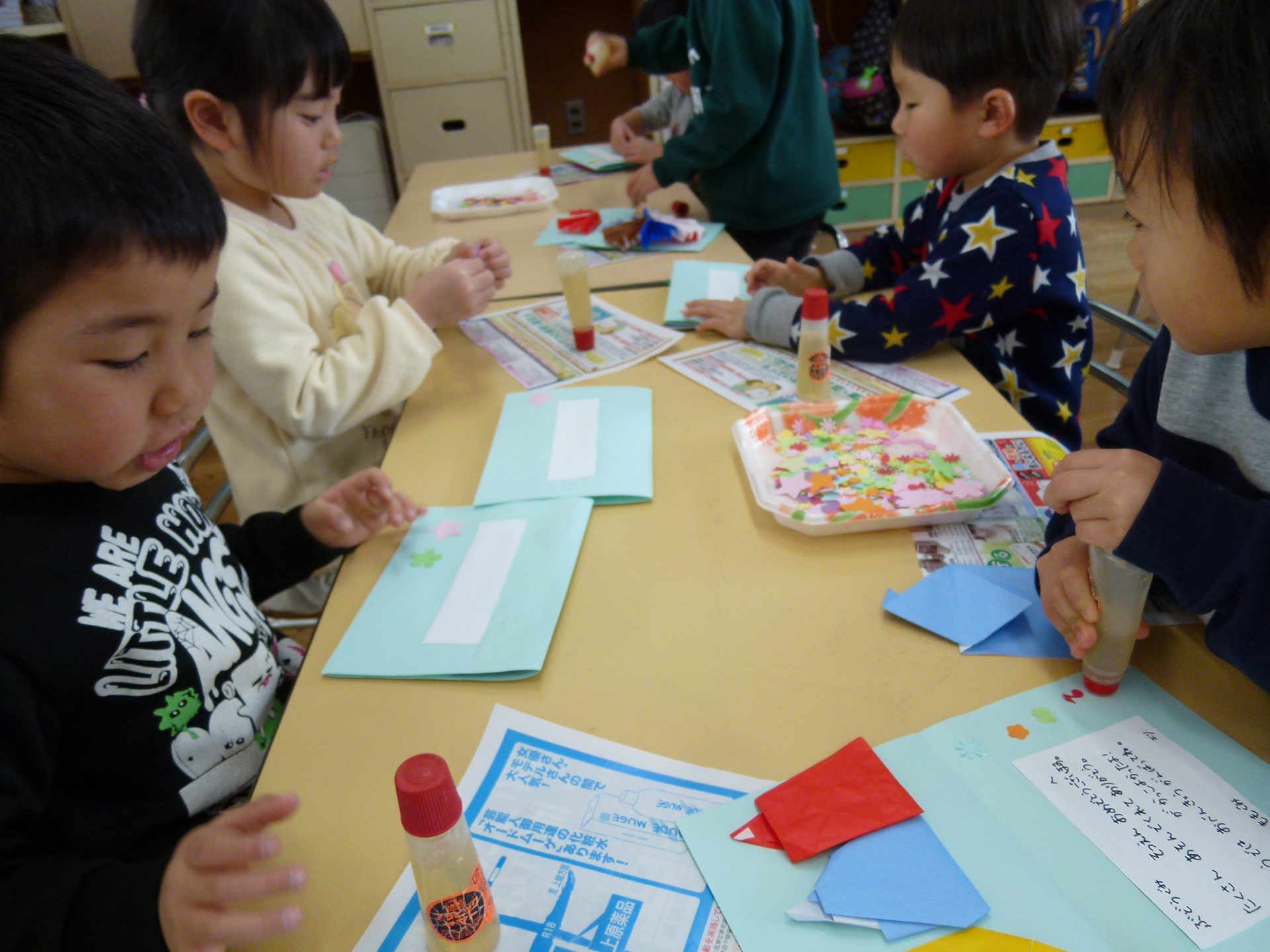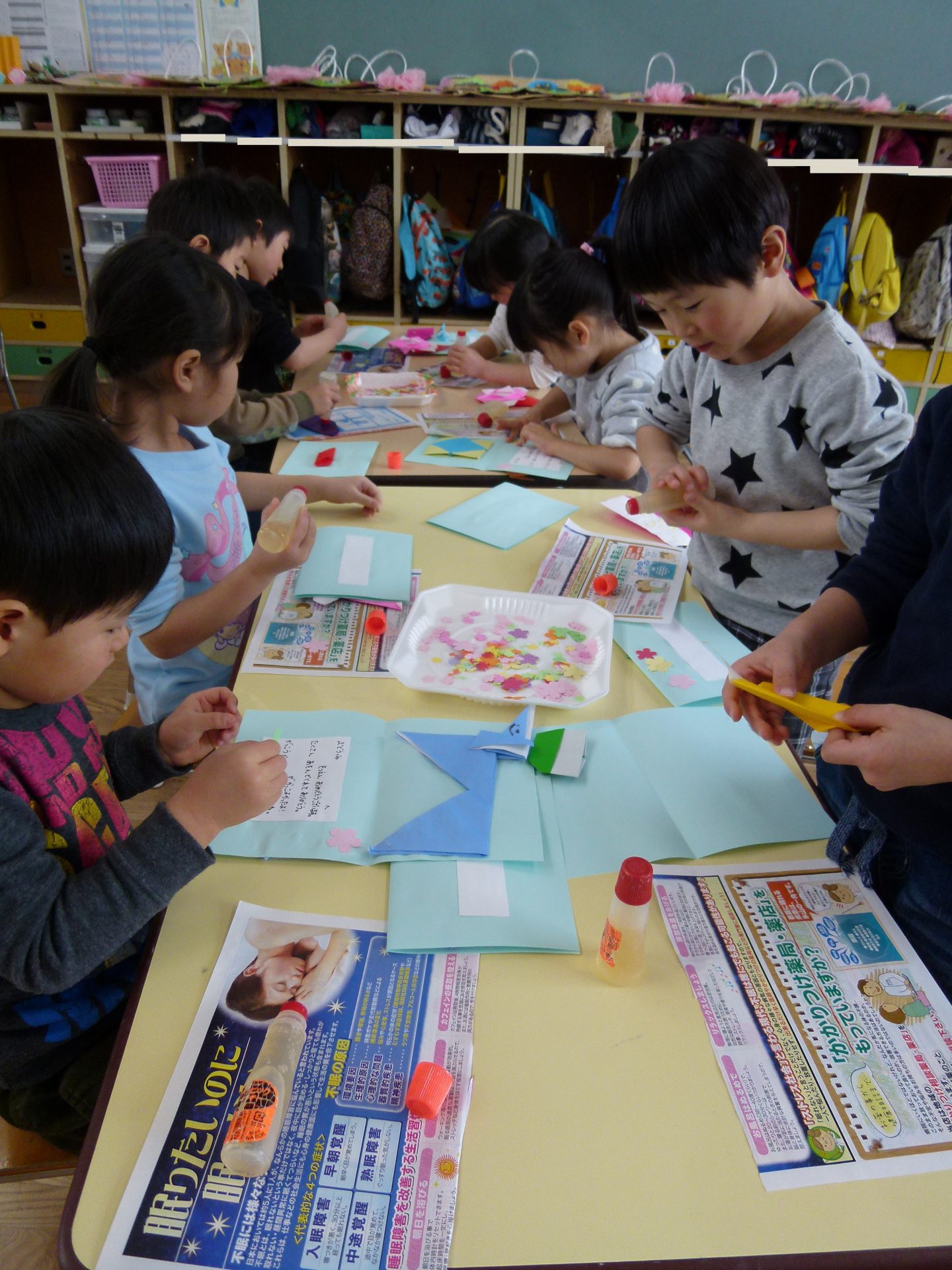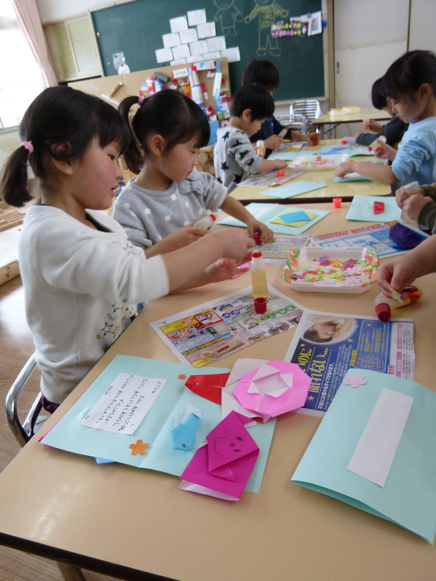 次はお手紙作り。折り紙で作ったプレゼントを貼り付けて作りました。一人ひとり作った折り紙は違いますが、ありがとうの気持ちは一人ひとり同じくらい込められています。